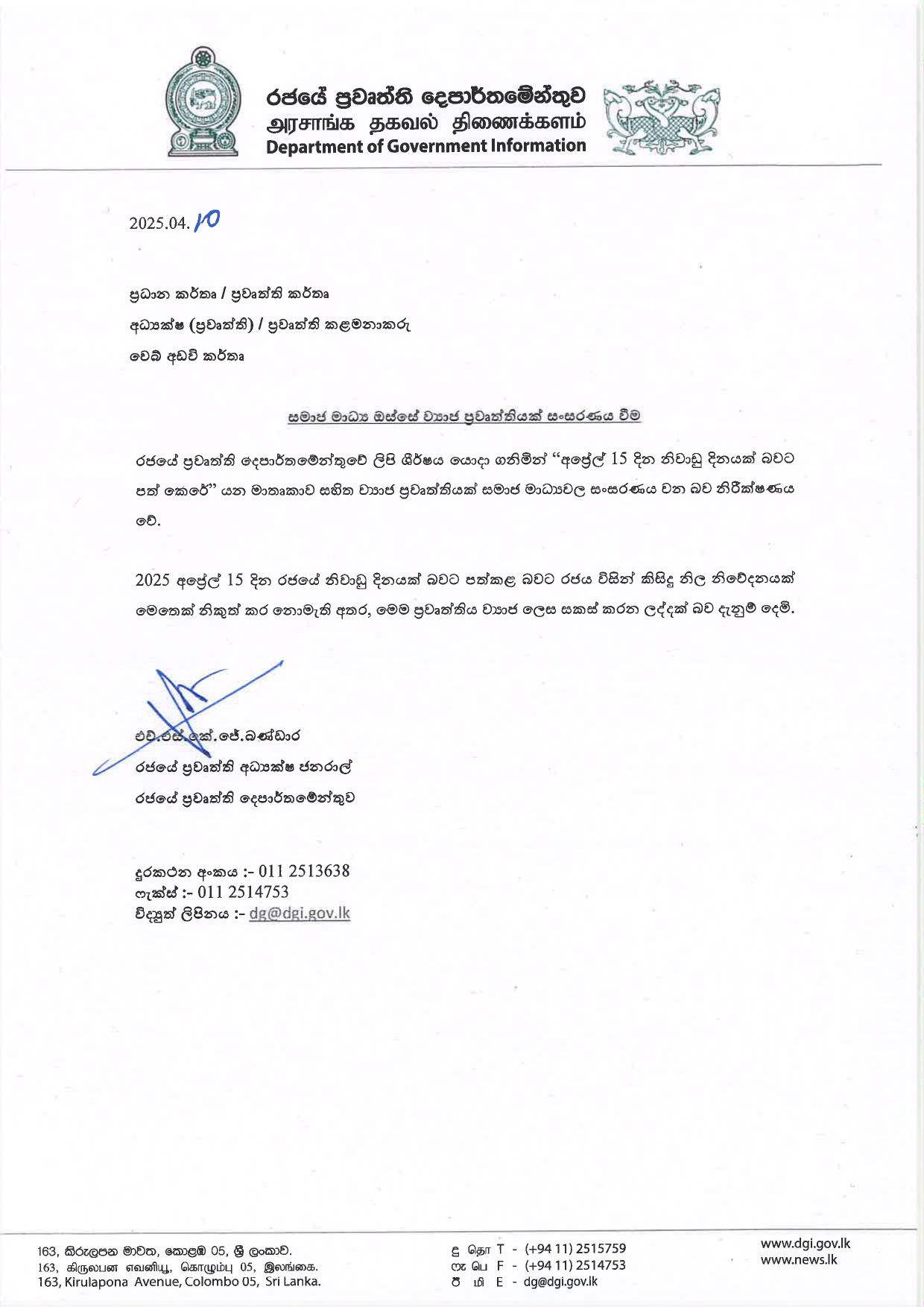 ஏப்ரல் 15 ஆம் திகதி அரச விடுமுறை தினம் என்று சமூக ஊடகங்களில் பரவி வரும் தகவல் போலியானது என அரசாங்க தகவல் திணைக்களம் தெரிவித்துள்ளது.