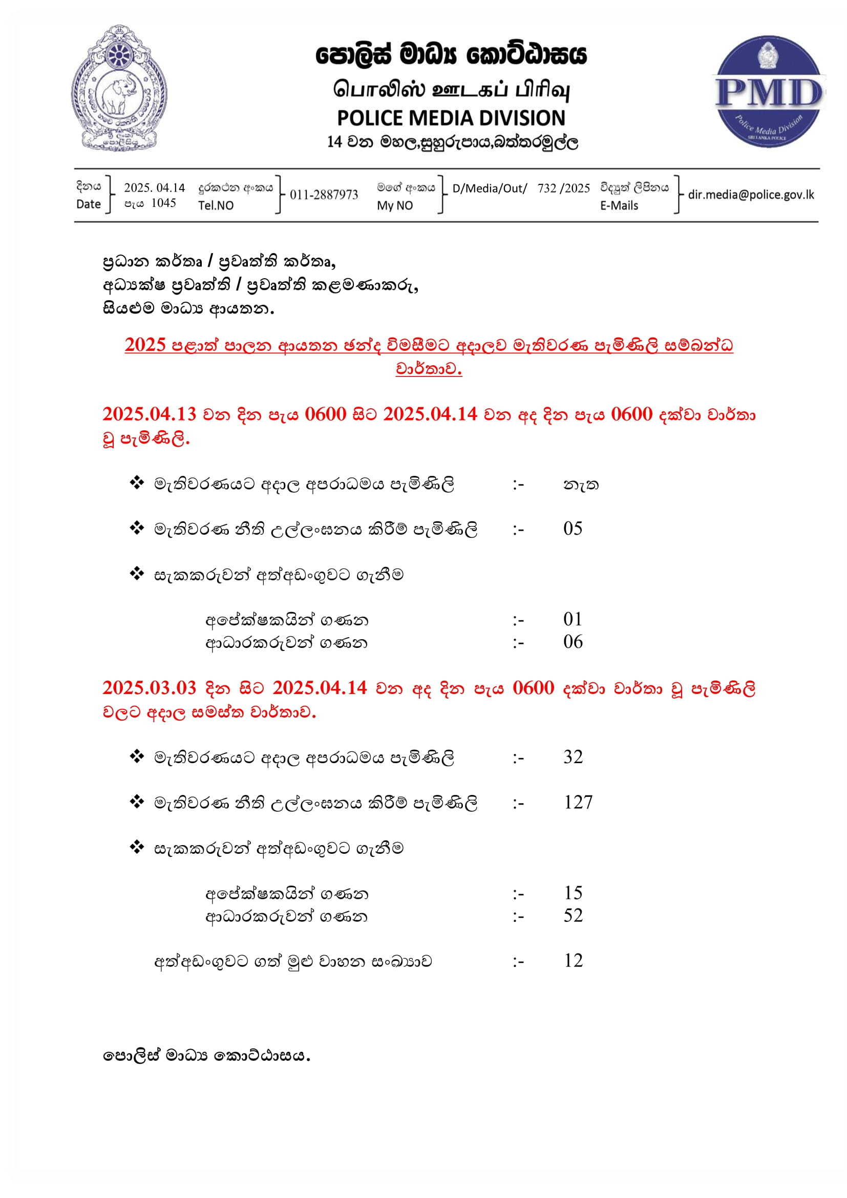 2025 ஆம் ஆண்டுக்கான உள்ளூராட்சி சபைத் தேர்தல் தொடர்பில் இதுவரை (மார்ச் மாதம் 03 ஆம் திகதி முதல் ஏப்ரல் மாதம் 14 ஆம் திகதி) 159 முறைப்பாடுகள் கிடைத்துள்ளதாக பொலிஸ் ஊடகப் பிரிவு தெரிவித்துள்ளது.