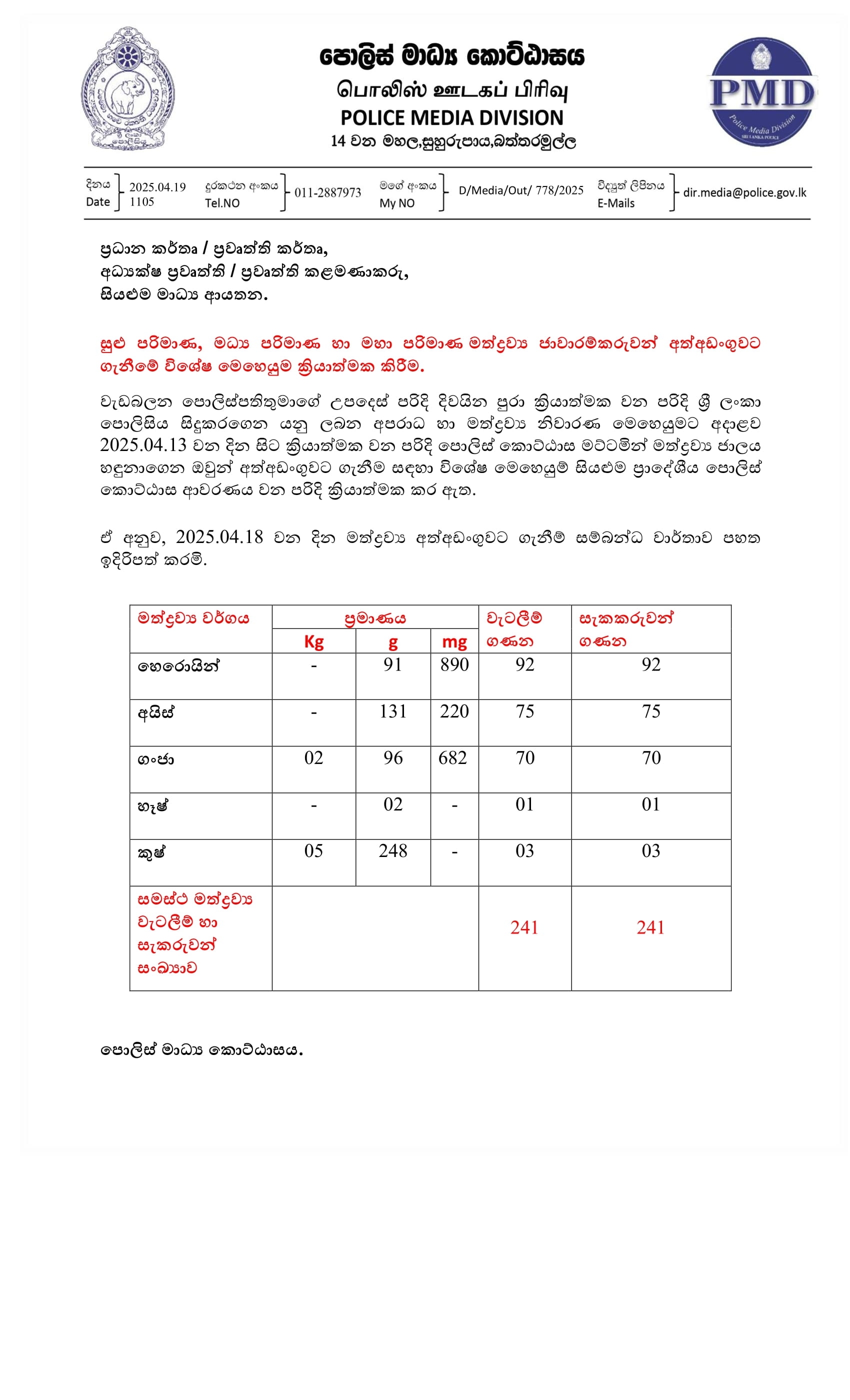 இந்த விசேட சுற்றிவளைப்பு நடவடிக்கையின் போது, 91 கிராம் 890 மில்லிகிராம் ஹெரோயின் போதைப்பொருளும், 131 கிராம் 220 மில்லிகிராம் ஐஸ் போதைப்பொருளும், 02 கிலோ 96 கிராம் கஞ்சா போதைப்பொருளும், 2 கிராம் ஹேஷ் போதைப்பொருளும், 05 கிராம் 248 மில்லிகிராம் குஷ் போதைப்பொருளும் கைப்பற்றப்பட்டுள்ளதாக பொலிஸ் ஊடகப் பிரிவு மேலும் தெரிவித்துள்ளது.