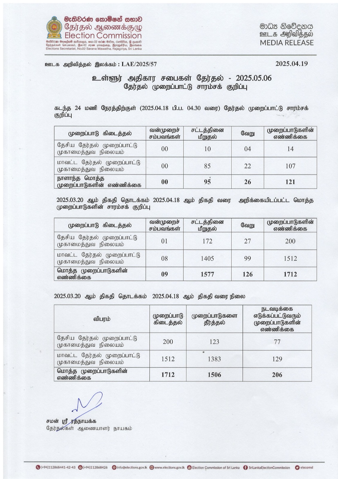 2025 ஆம் ஆண்டுக்கான உள்ளூராட்சி சபைத் தேர்தல் தொடர்பில் இதுவரை (மார்ச் மாதம் 20 ஆம் திகதி முதல் ஏப்ரல் மாதம் 18 ஆம் திகதி) 1,712 முறைப்பாடுகள் கிடைத்துள்ளதாக தேர்தல் ஆணைக்குழு தெரிவித்துள்ளது.