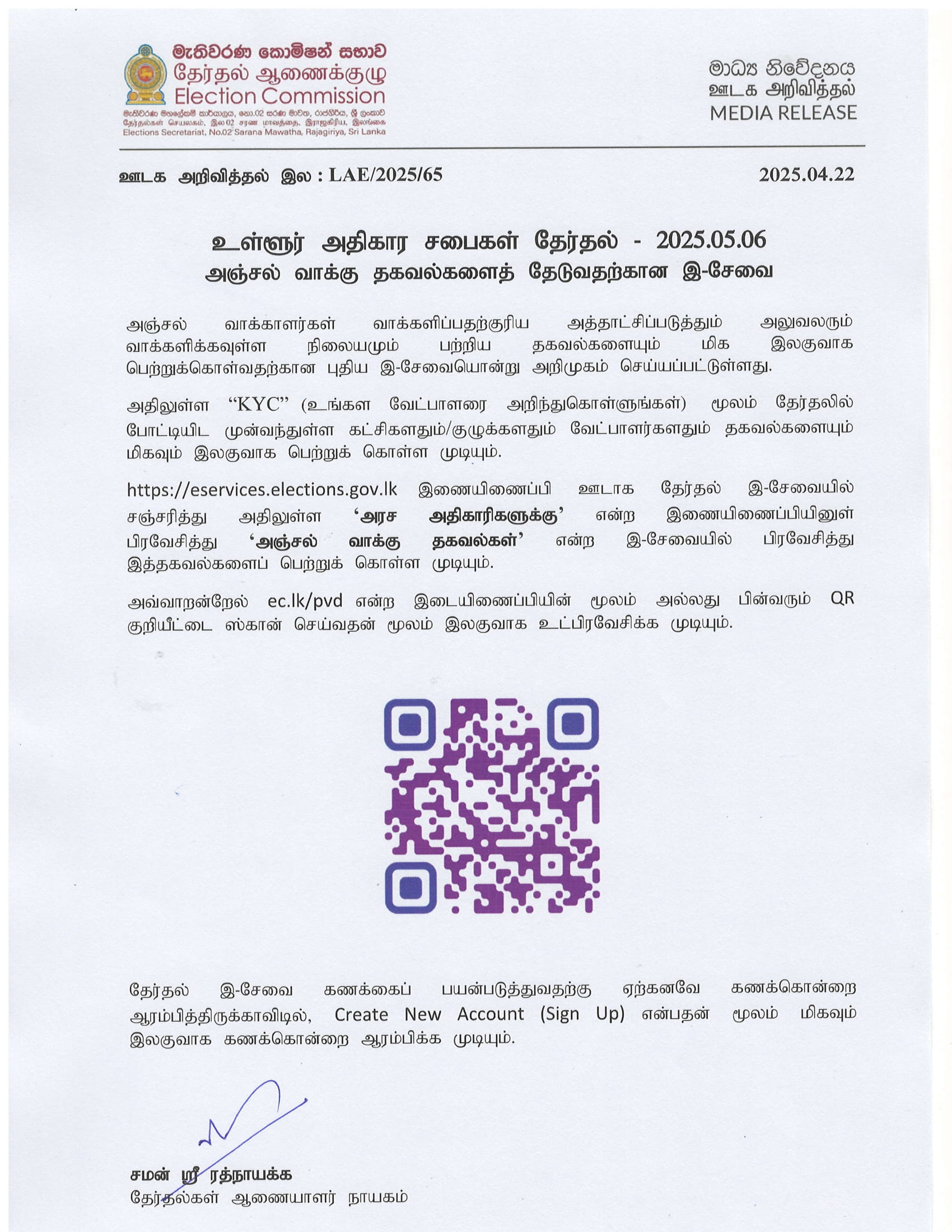2025 ஆம் ஆண்டுக்கான உள்ளூராட்சி சபைத் தேர்தலுக்காக தபால் மூலம் வாக்களிக்கவுள்ள வாக்காளர்கள் தபால் மூலம் வாக்களிப்பு தொடர்பான தகவல்களை அறிந்து கொள்ளுவதற்கு இ – சேவை அறிழமுகம் செய்யப்பட்டுள்ளதாக தேர்தல் ஆணைக்குழு தெரிவித்துள்ளது.