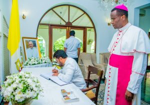 பின்னர், பேராயருடன் சிறிது நேரம் உரையாடிய ஜனாதிபதி, அங்கு வைக்கப்பட்டிருந்த இரங்கல் புத்தகத்தில் பரிசுத்த பாப்பரசருக்கான தனது இரங்கல் குறிப்பினை பதிவு செய்தார்.