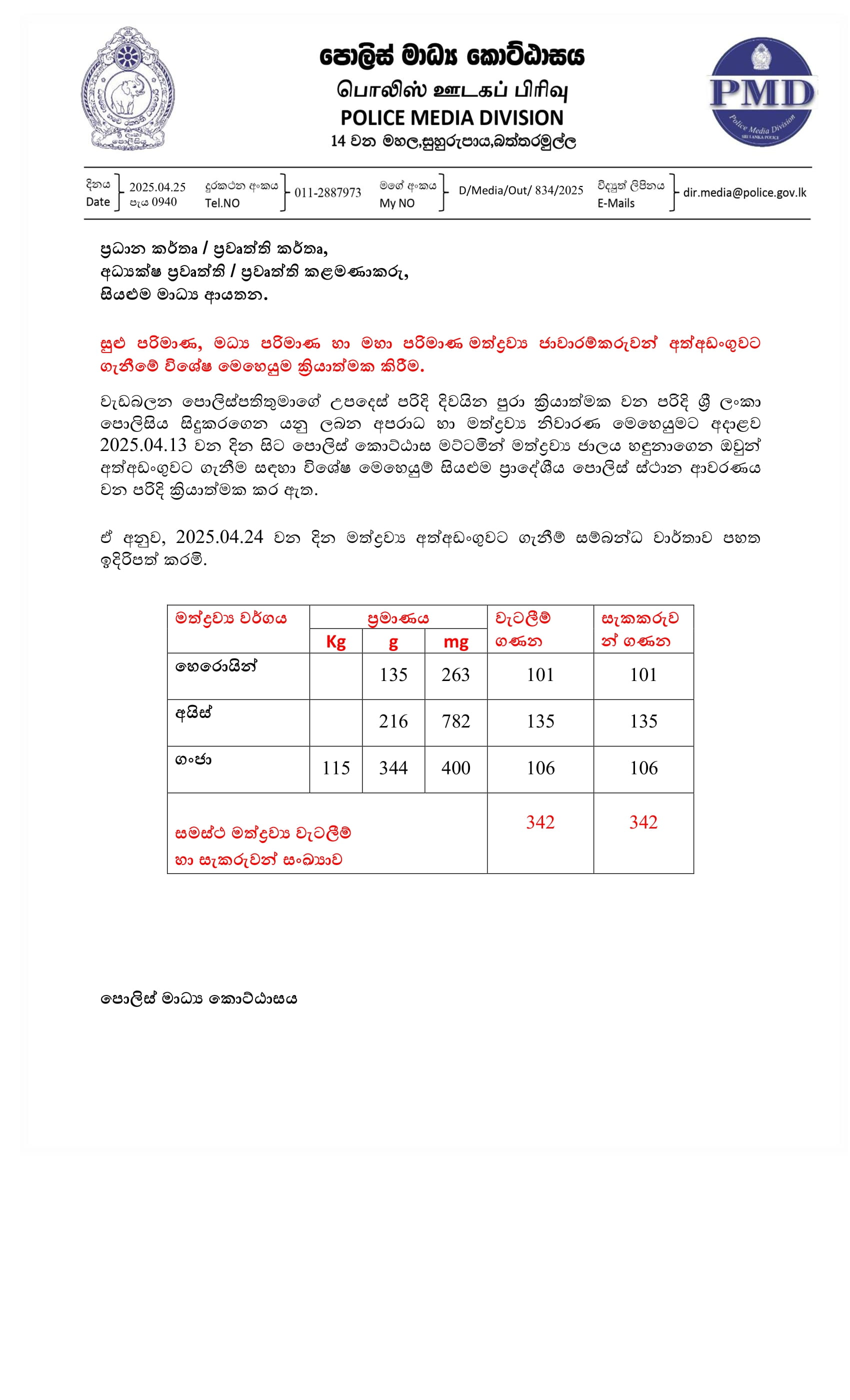 இந்த விசேட சுற்றிவளைப்பு நடவடிக்கையின் போது, 135 கிராம் 263 மில்லிகிராம் ஹெரோயின் போதைப்பொருளும், 216 கிராம் 782 மில்லிகிராம் ஐஸ் போதைப்பொருளும், 115 கிலோ 344 கிராம் கஞ்சா போதைப்பொருளும் பொலிஸாரால் கைப்பற்றப்பட்டதாக பொலிஸ் ஊடகப் பிரிவு மேலும் தெரிவித்துள்ளது.