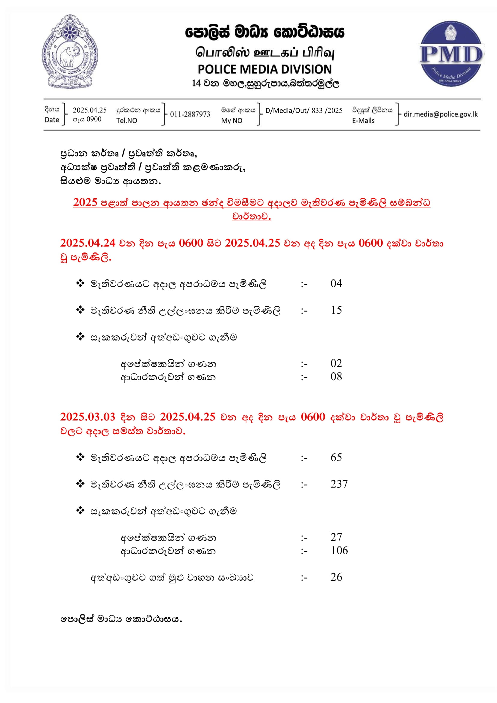 தேர்தல் நடவடிக்கைகளுக்காக சட்டவிரோதமாக பயன்படுத்தப்பட்ட 26 வாகனங்களும் பொலிஸாரால் கைப்பற்றப்பட்டதாக பொலிஸ் ஊடகப் பிரிவு மேலும் தெரிவித்துள்ளது.