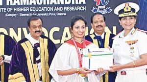 போரூரில் உள்ள ஸ்ரீராமச்சந்திரா உயர்கல்வி மற்றும் ஆராய்ச்சி நிறுவனத்தின் 39-வது பட்டமளிப்பு விழா நேற்று நடைபெற்றது. ராணுவ மருத்துவ சேவைகள் துறையின் டைரக்டர் ஜெனரல் வைஸ் அட்மிரல் ஆர்த்தி சரீன் சிறப்பாக தேறிய 29 மாணவர்களுக்கு 40 தங்க பதக்கங்களை வழங்கினார். எம்பிபிஎஸ் மாணவி வி.சஞ்சனா 5 தங்கப் பதக்கங்களை பெற்றார்.