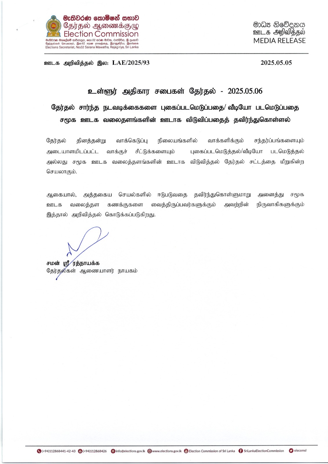 நாளை செவ்வாய்க்கிழமை (06) நடைபெறவுள்ள உள்ளூராட்சி சபைத் தேர்தலுடன் தொடர்புடைய நடவடிக்கைகளை புகைப்படம் அல்லது காணொளி எடுத்து சமூக ஊடகங்களில் பதிவிடுவது தேர்தல் சட்டங்களை மீறும் செயல்களாகும் என தேர்தல் ஆணைக்குழு தெரிவித்துள்ளது.