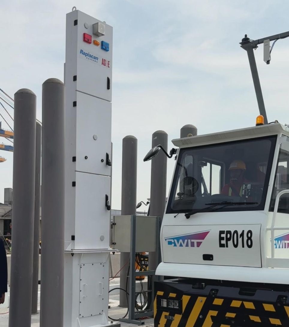 மேற்கு கொள்கலன் முனையத்தில் புதிதாக செயற்பாட்டுக்கு இணைத்துக்கொள்ளப்பட்ட கதிர்வீச்சு கண்டறியும் கருவியினை வாகனமொன்று நெருங்குவதை இங்கு காணலாம்.