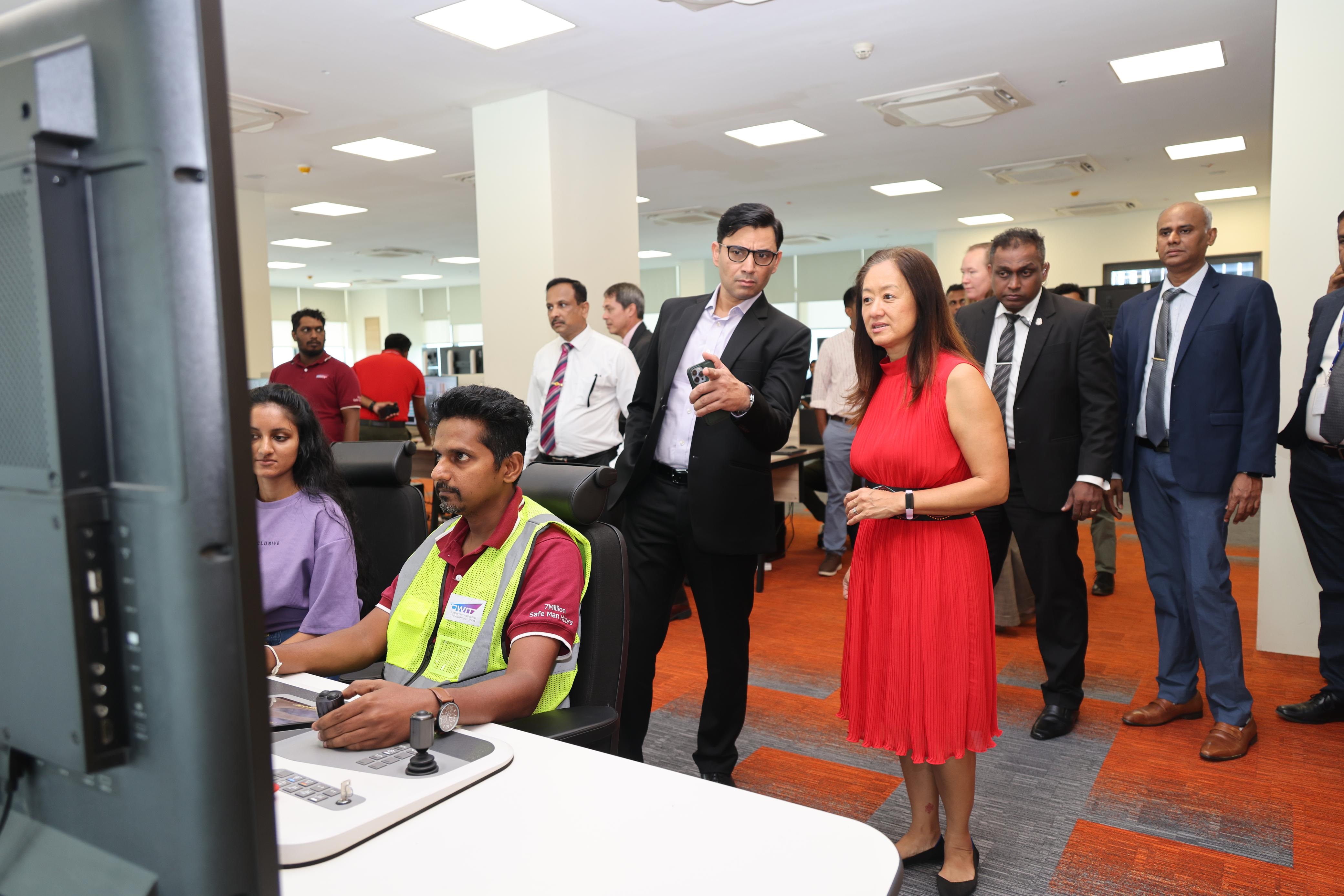 அமெரிக்க தூதுவர் ஜூலீ சங் கொழும்பு மேற்கு சர்வதேச முனையத்தின் பிரதம நிறைவேற்று அதிகாரி முனிஷ் கன்வாருடன் இணைந்து முனையத்தின் கட்டுபாட்டு அறையை பார்வையிடுவதை இங்கு காணலாம்.