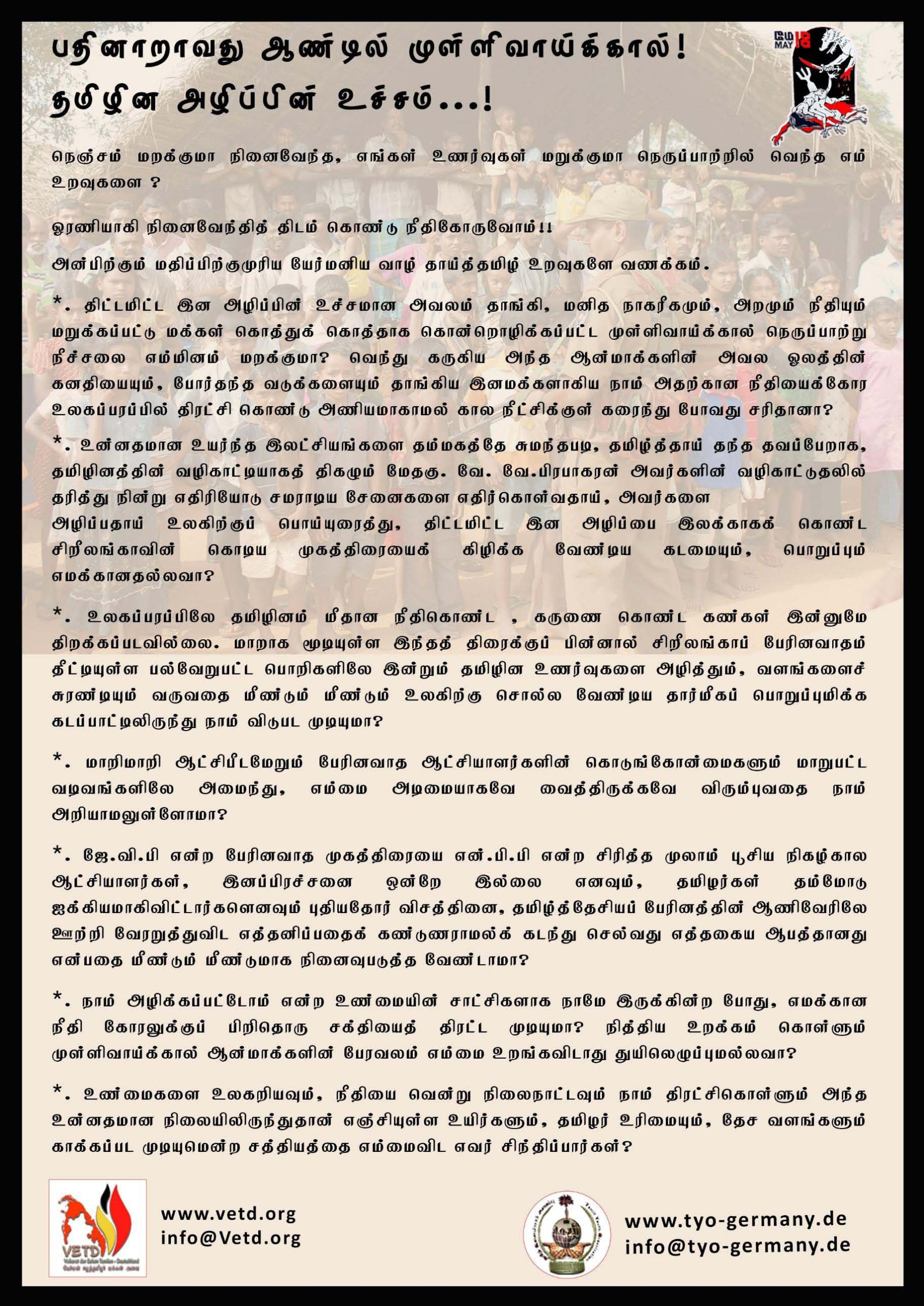 மே18 சிறிலங்கா அரசாங்கத்தின் தமிழின அழிப்புக்கு நீதி கோரியும் ,இனப்படுகொலை செய்யப்பட்ட எமது மக்களுக்கு தீபம் ஏற்றி மலர் தூவி இதயவணக்கத்தைச் செலுத்துவதற்கும் யேர்மனி வாழ் தமிழீழ மக்கள் அனைவரையும் உரிமையுடன் Düssldorf மாநில அவைக்கு முன்பாக அணிதிரளுமாறு வேண்டுகின்றோம்.