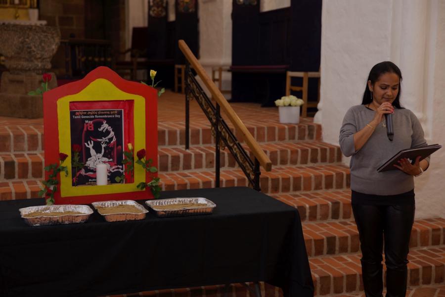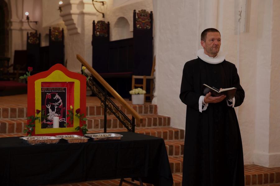 அருட்தந்தை Steen F. Søvndalk அவர்களினால் தோத்திரப் பாடல்கள் பாடப்பட்டு திருப்பலி கொடுக்கப்பட்டதைத் தொடர்ந்து, விசேடமாக தேவலாயத்தில் வைக்கப்பட்டிருந்த முள்ளிவாய்க்கால் நினைவுத் தூபிக்கு அருட்தந்தை அவர்கள் முதன்மைச் சுடர் ஏற்றி மலர் வணக்கம் செலுத்தினார்.