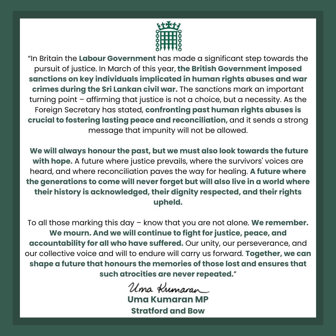 நீதிக்கான பாதை கடினமானதாக வலிமிகுந்ததாக காணப்படுகின்ற போதிலும், உலக நாடுகளிலும் பிரிட்டனிலும் காணப்படுகின்ற எங்கள் மக்களின் வலிமை மற்றும் மீள் எழும் தன்மை, நம்பிக்கை நீடிப்பதை வெளிப்படுத்துகின்றது.கடந்து செல்லும் ஒவ்வொரு வருடமும் உண்மைக்கான குரல் மேலும் வலுவடைகின்றது,பொறுப்புக்கூறலிற்கான வேண்டுகோள் மேலும் வலுவடைகின்றது.
