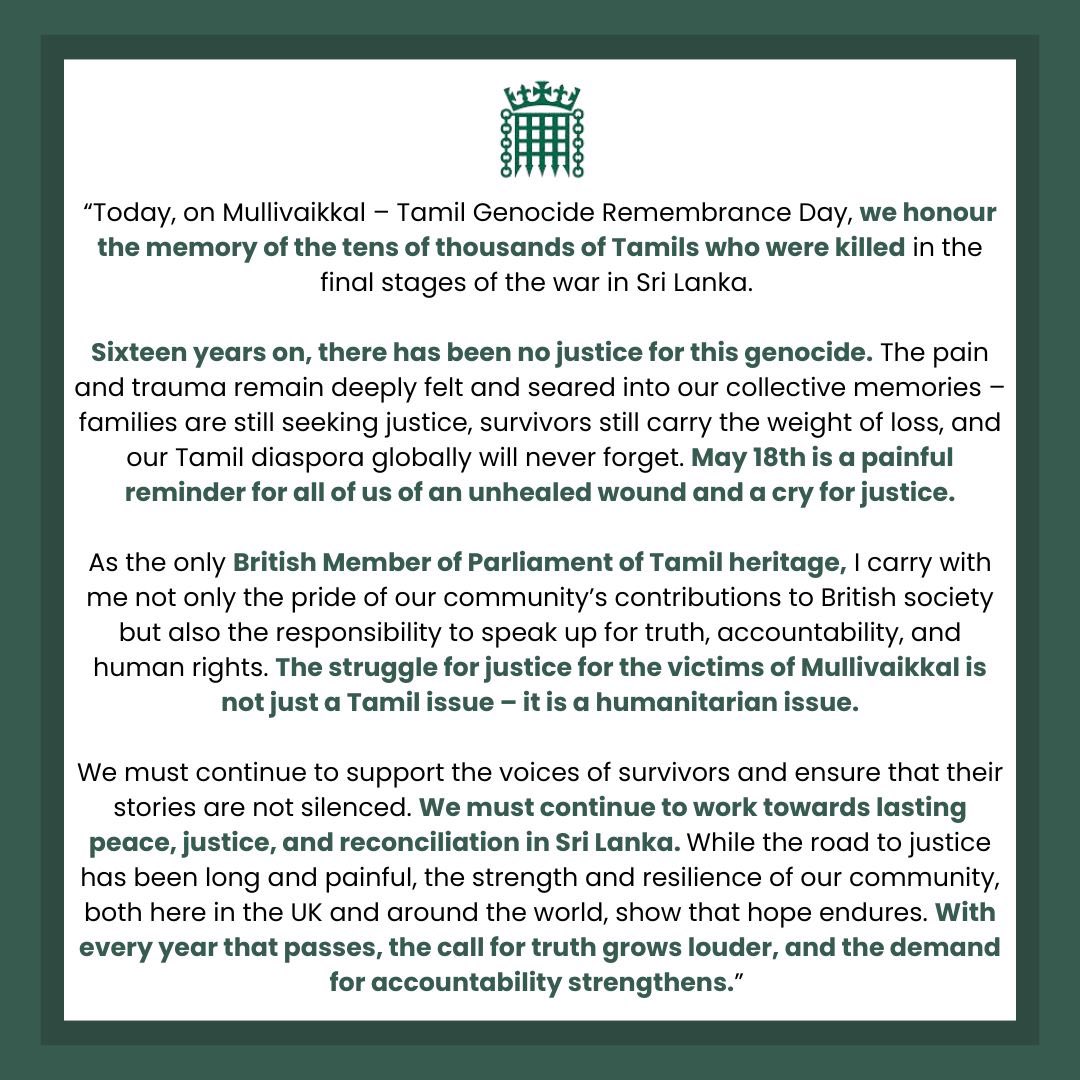 தமிழ் பாரம்பரியத்தை உடைய பிரிட்டனின் ஒரேயொரு நாடாளுமன்ற உறுப்பினர் என்ற அடிப்படையில்,பிரிட்டிஸ் சமூகத்திற்கான எனது பங்களிப்பு குறித்த பெருமிதத்தை மாத்திரம் நான் சுமக்கவில்லை,உண்மைக்காக பொறுப்புக்கூறலிற்காக மனித உரிமைகளிற்காக குரல் கொடுக்கவேண்டிய பொறுப்பையும் நான்சுமக்கின்றேன்.