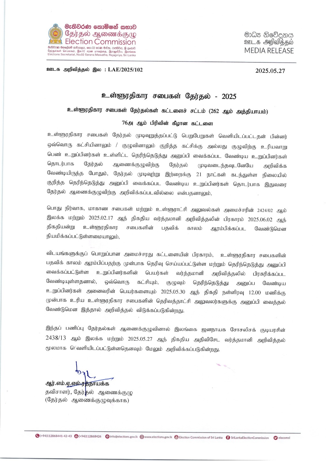 உள்ளூராட்சி சபைத் தேர்தலின் பெறுபேறுகளின் பிரகாரம் அந்தந்த கட்சிகள் மற்றும் சுயேச்சைக் குழுக்களால் தேர்ந்தெடுக்கப்பட்ட உறுப்பினர்களின் விபரங்கள் எதிர்வரும் 30 ஆம் திகதி நள்ளிரவு 12.00 மணிக்கு முன்னர் உரிய உள்ளூராட்சி அதிகார சபைகளின் தெரிவத்தாட்சி அலுவலர்களிடம் சமர்ப்பிக்கப்பட வேண்டும் தேர்தல் ஆணைக்குழு தெரிவித்துள்ளது.