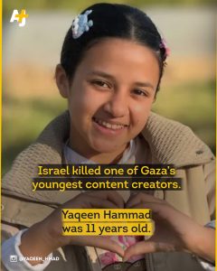 இஸ்ரேல் காசாவில் சமீபத்தில் மேற்கொண்டுள்ள தாக்குதல்களில் பல சிறுவர்கள் கொல்லப்பட்டுள்ளனர் அவர்களில் காசாவின் மிகவும் வயது குறைந்த இன்புளுன்சரான 11 வயது யாகீன் ஹம்மாத்தும் கொல்லபட்டாள் என கார்டியன் செய்தி வெளியிட்டுள்ளது.