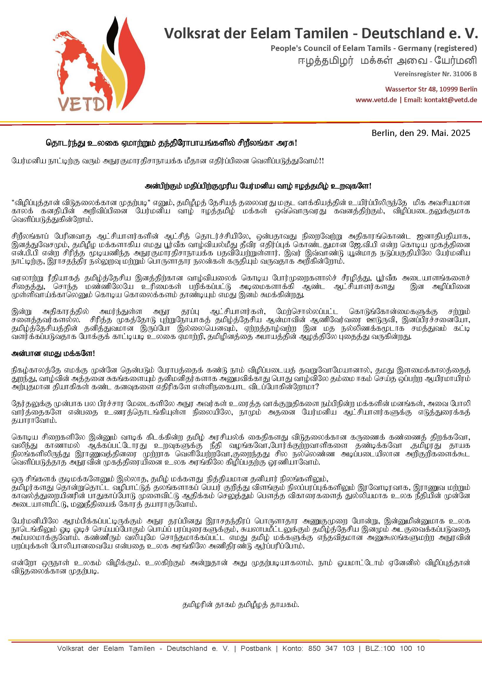 சிறீலங்காப் பேரினவாத ஆட்சியாளர்களின் ஆட்சித் தொடர்ச்சியிலே, ஒன்பதாவது நிறைவேற்று அதிகாரங்கொண்ட ஜனாதிபதியாக, இனத்துவேசமும், தமிழீழ மக்களாகிய எமது பூர்வீக வாழ்வியல்மீது தீவிர எதிர்ப்புக் கொண்டதுமான ஜே.வி.பி என்ற கொடிய முகத்தினை என்.பி.பி என்ற சிரித்த மூடியணிந்த அநுர குமார திசாநாயக்க பதவியேற்றுள்ளார். இவர் இவ்வாண்டு யூன்மாத நடுப்பகுதியிலே யேர்மனிய நாட்டிற்கு, இராசதந்திர நல்லுறவு மற்றும் பொருளாதார நலன்கள் கருதியும் வருவதாக அறிகின்றோம்.