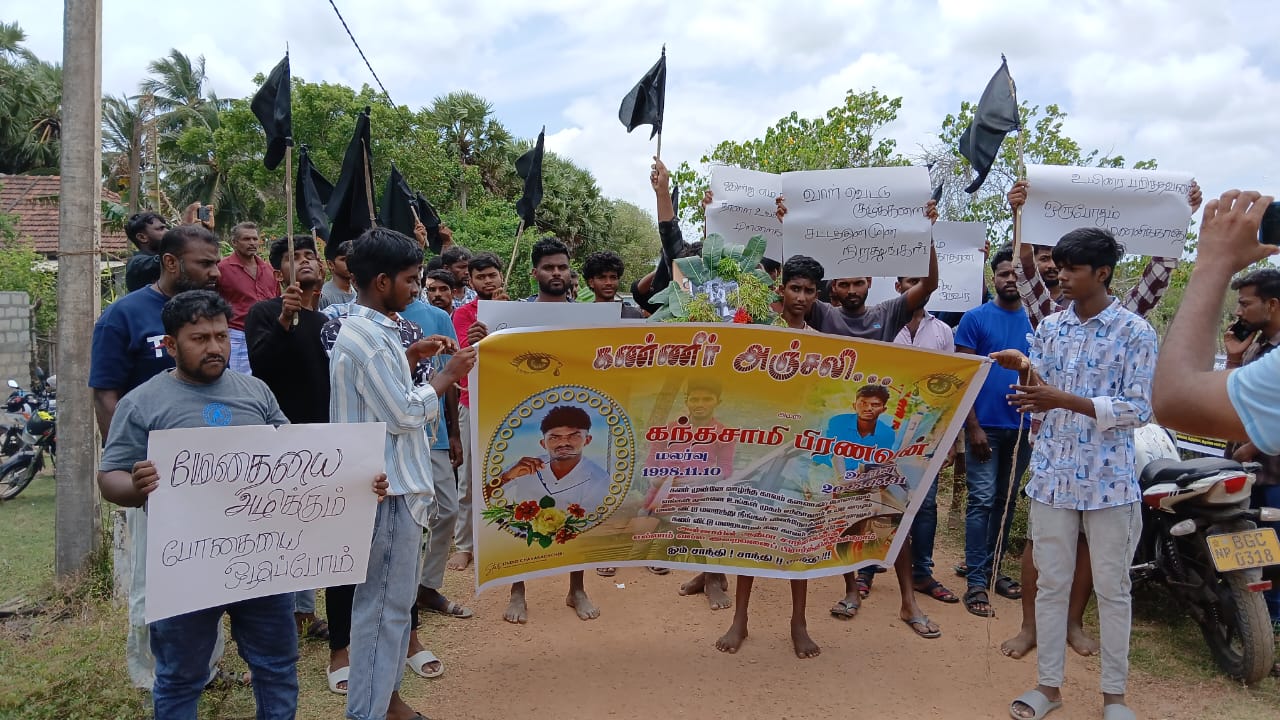 கிளிநொச்சி பூநகரி பொலிஸ் பிரிவுக்குட்பட்ட தம்பிராய் குளத்துக்கு அருகில் கடந்த 31ஆம் திகதி இனந்தெரியாத நபர்களின் வாள்வெட்டுக்கு இலக்காகி உயிரிழந்த, பூநகரி செம்மன்குன்று பகுதியைச் சேர்ந்த நபரின் இறுதிக்கிரியை இன்று (3) நடைபெற்ற நிலையில், இறுதி ஊர்வலத்தின்போது இக்கொலைக்கு நீதி கோரி பிரதேச மக்கள் கவனயீர்ப்பு ஆர்ப்பாட்டத்தில் ஈடுபட்டனர்.