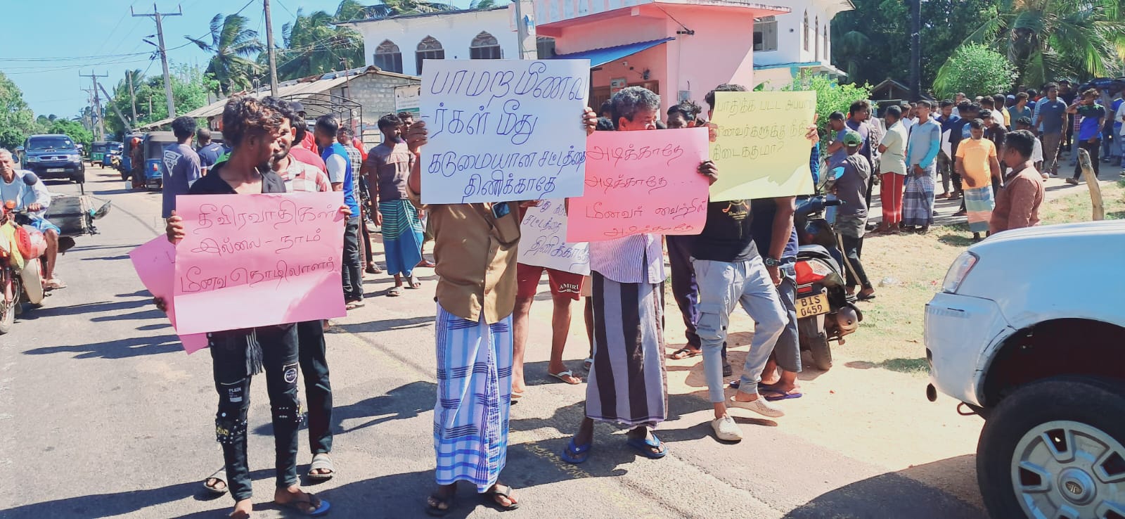 இதன்போது “பாமர மக்கள்மீது கடுமையான சட்டத்தை திணிக்காதே”, “தீவிரவாதிகள் இல்லை நாம் மீனவ தொழிலாளர்” அடிக்காதே அடிக்காதே மீனவர் வயிற்றில் அடிக்காதே போன்ற வாசகங்கள் அடங்கிய சுலோகங்களை ஏந்தியவாறு மக்கள் ஆர்ப்பாட்டத்தில் ஈடுபட்டனர்.