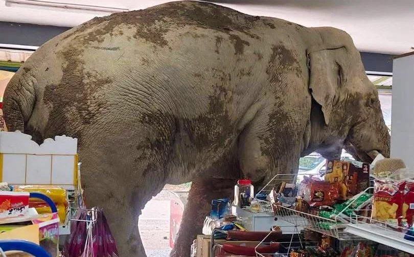 சுமார் நான்கு டன் எடையுள்ள ஆண் யானை தாய்லாந்தின் வடகிழக்கு நகரமான நகோன் ராட்சசிமாவில் உள்ள பல்பொருள் அங்காடியொன்றிற்குள் நுழைந்து கேக் முட்டைகள் போன்றவற்றை உண்பதை சிசிடிவி காட்சிகள் காண்பித்துள்ளன.