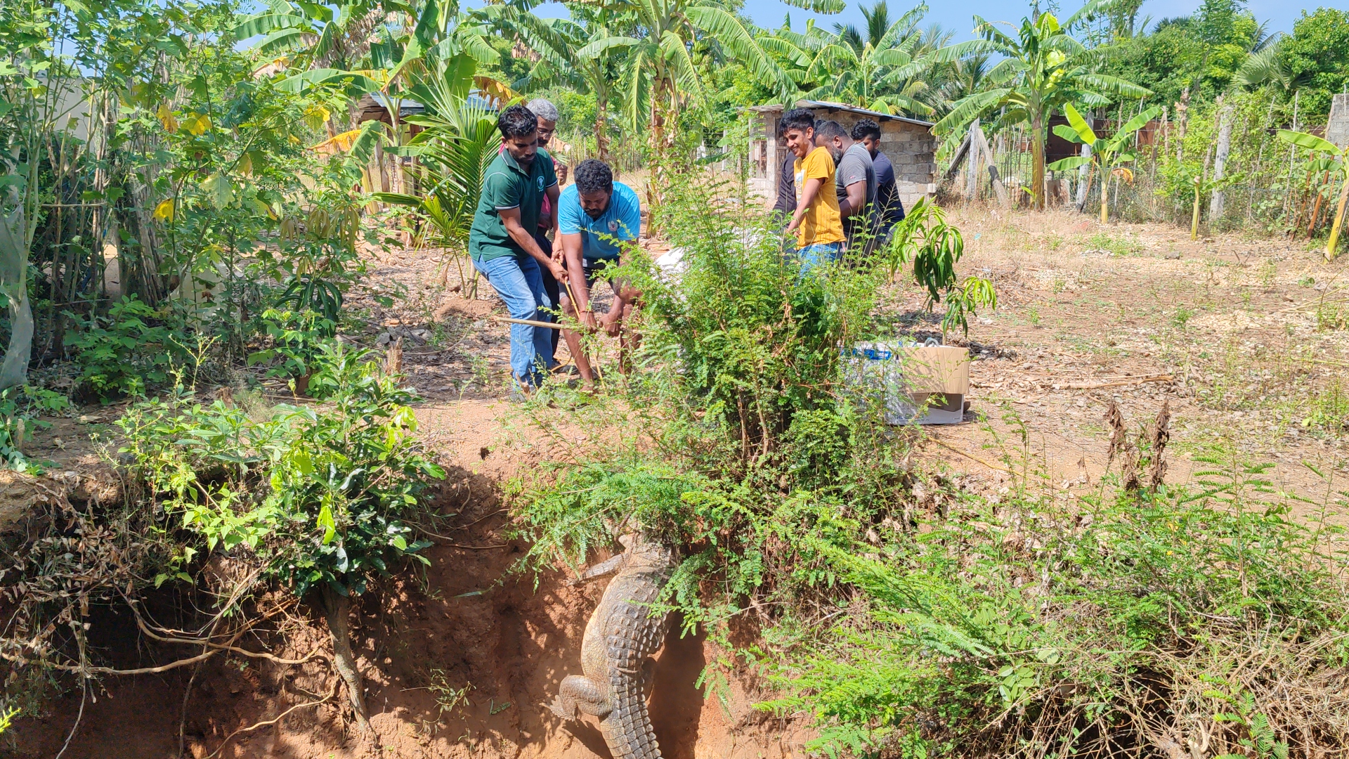 நேற்றைய தினம் புதன்கிழமை (4) அவ்வீட்டுக்கு பின்புறமுள்ள தோட்டப்பகுதியில் முதலை ஒன்று இருந்ததை வீட்டின் உரிமையாளர் அவதானித்துள்ளார். அவர் அதனை துரத்த முற்பட்டபோது, அக்காணியில் உள்ள கைவிடப்பட்ட கிணற்றில் முதலை வீழ்ந்துள்ளது.