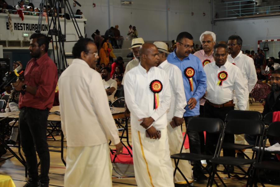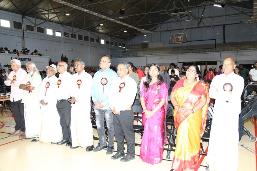 பின்னர் அகவணக்கம் செலுத்தப்பட்டது தொடர்ந்து விழா மேடையில் அனைத்துலகப் பொறுப்பாளர்களில் ஒருவரான திரு. றங்கன், தமிழர் ஒருங்கிணைப்பு குழு- பிரான்சு சார்பாக திரு பாலசுந்தரம், ரிரிஎன் சார்பாக திரு. ரூபன், தமிழ் சங்கங்களின் கூட்டமைப்பு சார்பாக திரு. பாலகுமாரன், தமிழ்ச்சோலை தலைமைச் செயலகம் மற்றும் ஒன்லே சுபுவா சங்கத் தலைவருமான திரு.விசுவநாதன், பிரான்சு தமிழ் பெண்கள் அமைப்பு பொறுப்பாளர் திருவாட்டி ஜனனி, பிரான்சு தமிழர் கலை பண்பாட்டுக் கழகம் சார்பில் செல்வி சோபி, அரசியல் துறைப் பொறுப்பாளர் செல்வி நிதுசா, மூத்தகலைஞர் திரு பரா, அனைத்துலக தமிழர் கலை பண்பாட்டுக்கழகப் பொறுப்பாளர் திரு.முகிலன் ஆகியோர் ஏற்றி வைத்தனர்.