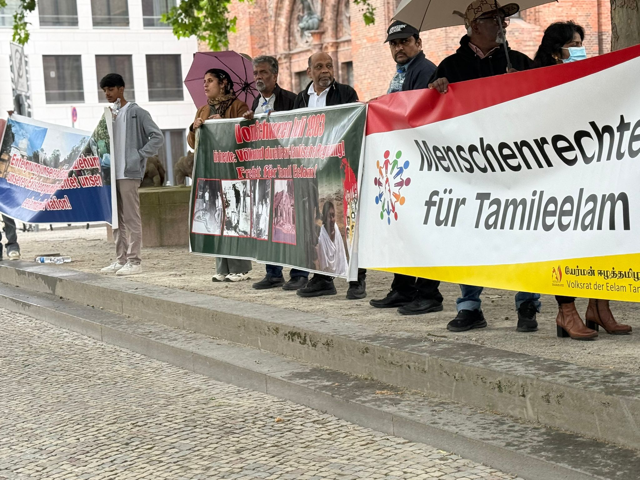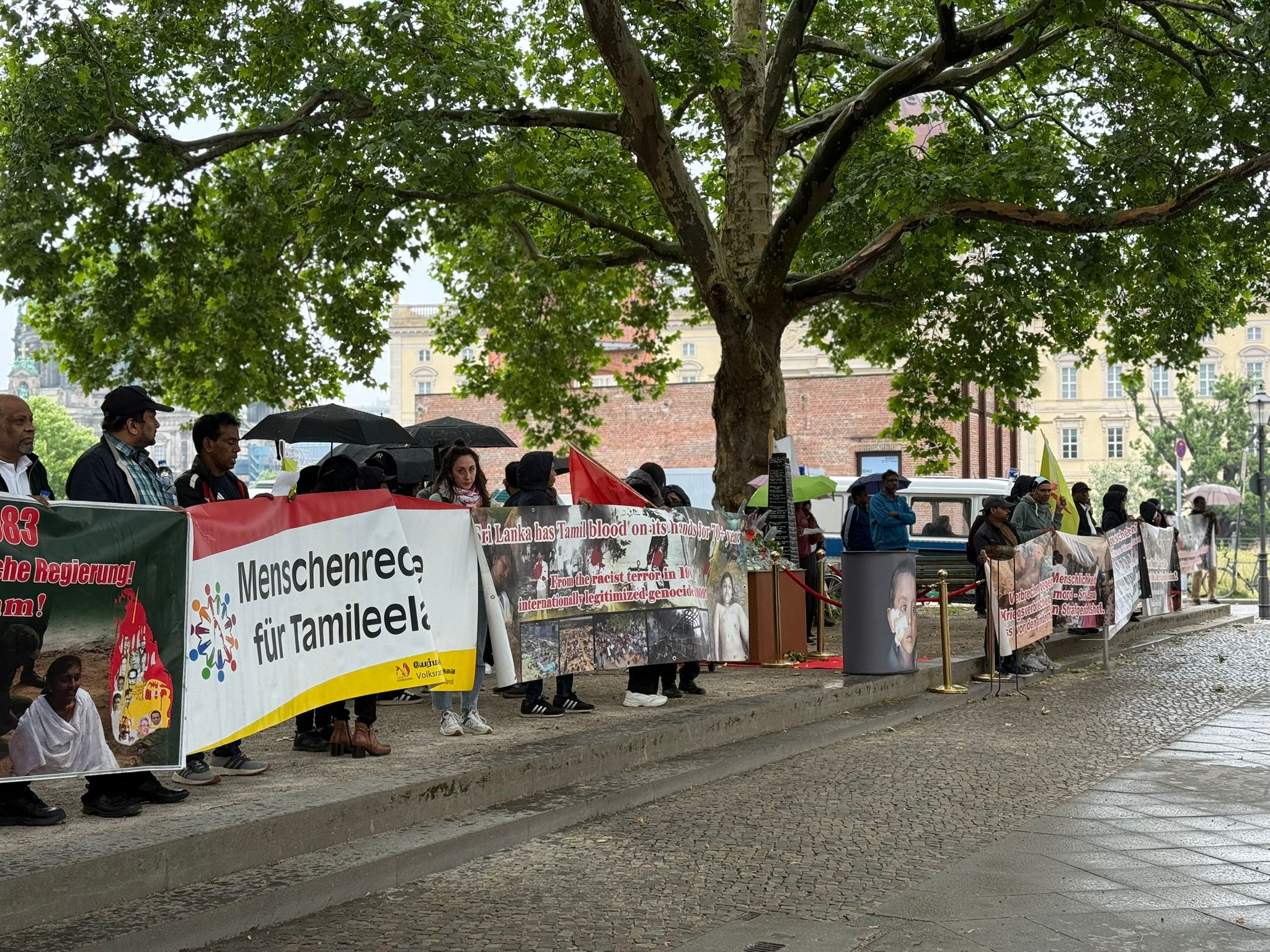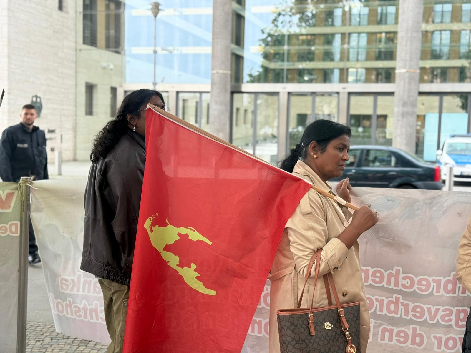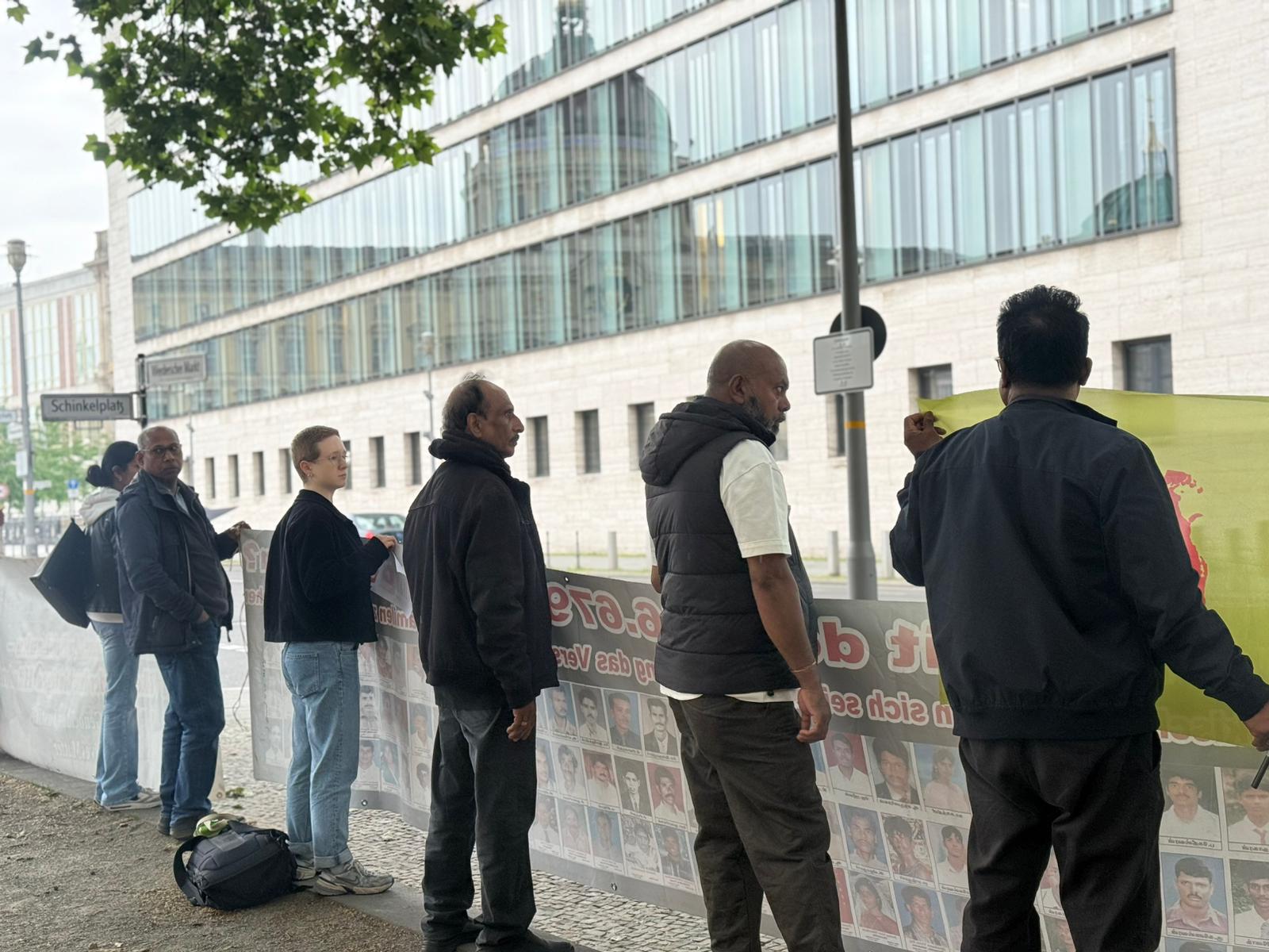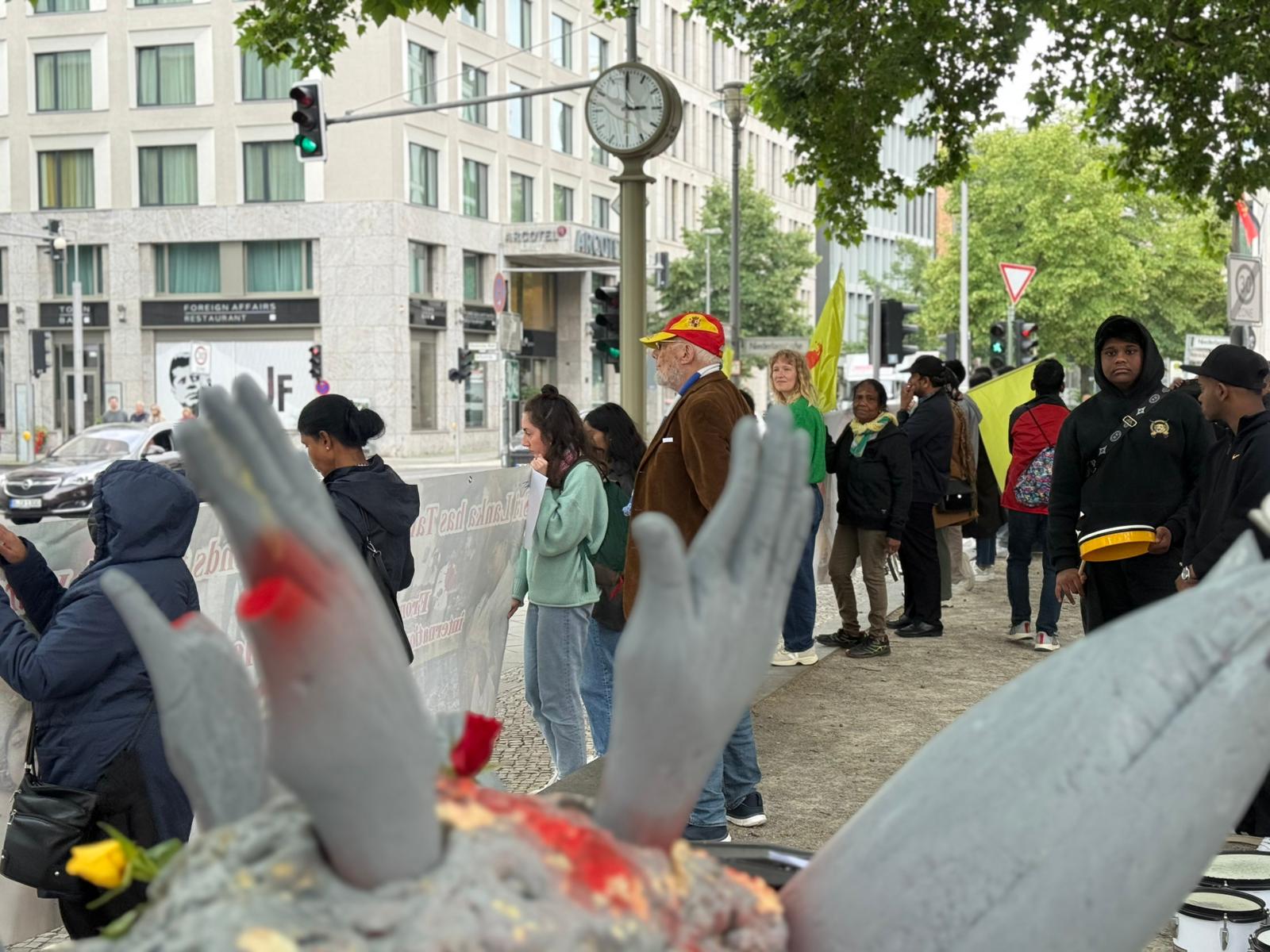 சிறிலங்கா தூதரகத்தின் பயமுறுத்தும் முயற்சிகளினையும் மீறி, இன்று பேர்லின் நகரில் உள்ள வெளிநாட்டு அலுவலகம் முன்பாக நூற்றுக்கும் மேற்பட்டவர்கள் திரண்டனர். தமிழர்களுடன் மற்ற மக்களும் கலந்து கொண்டு தங்களின் ஒற்றுமையையும் ஆதரவையும் வெளிப்படுத்தினர்.