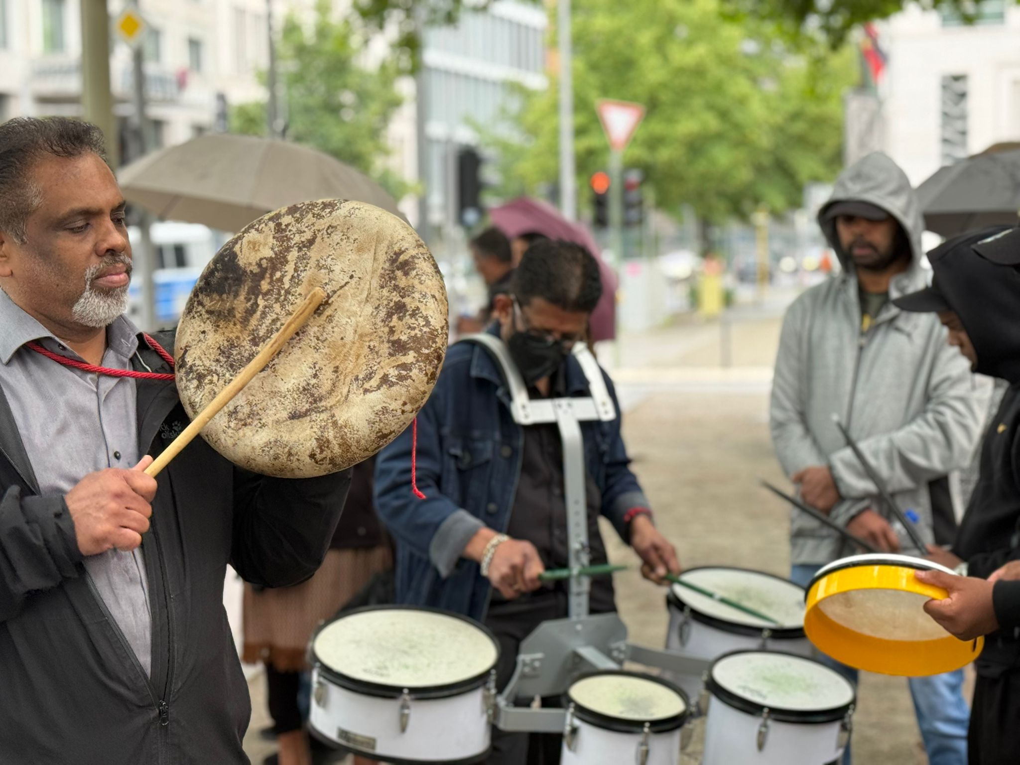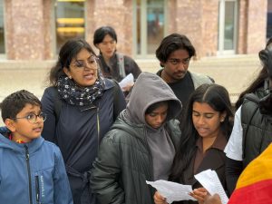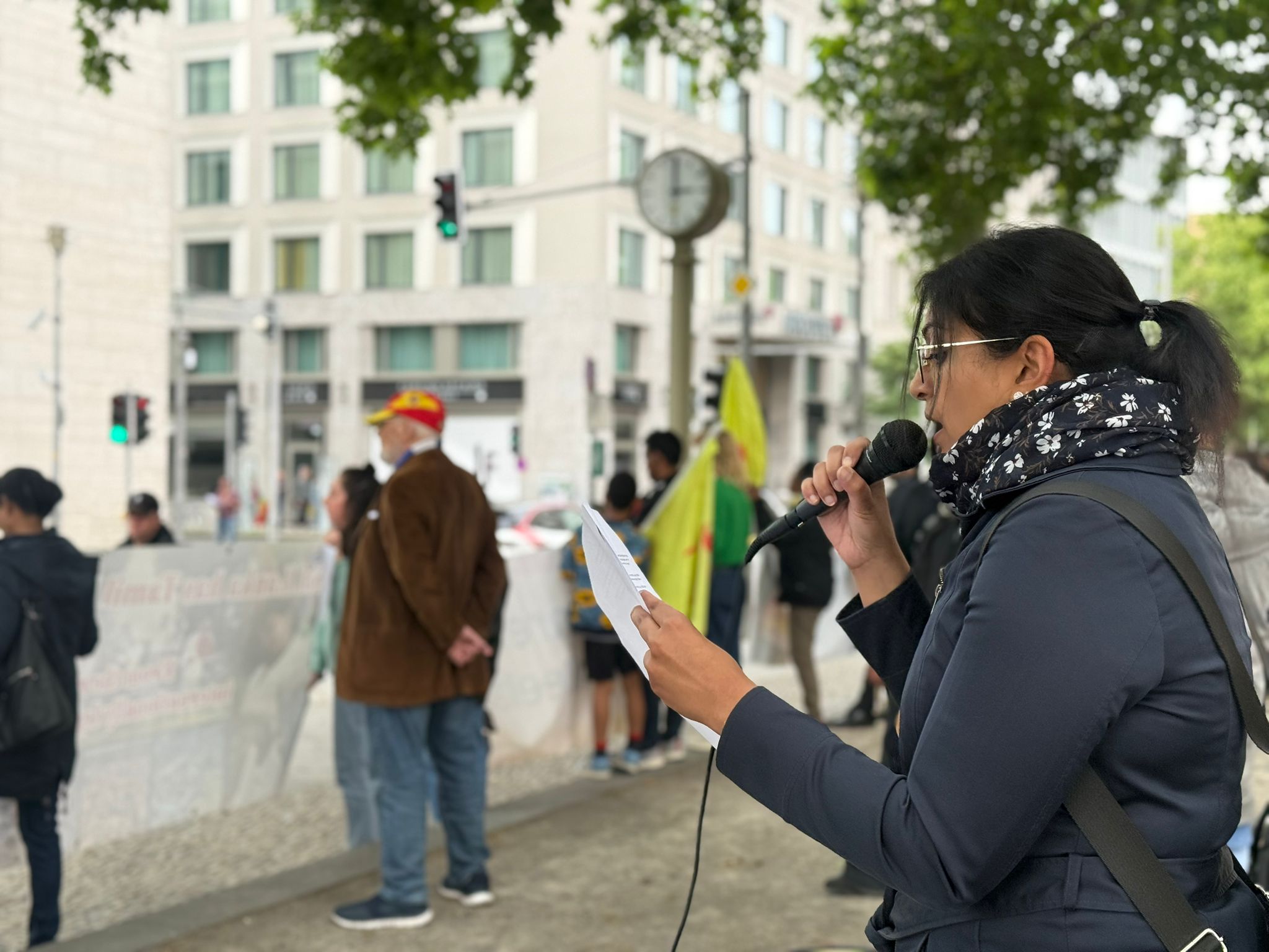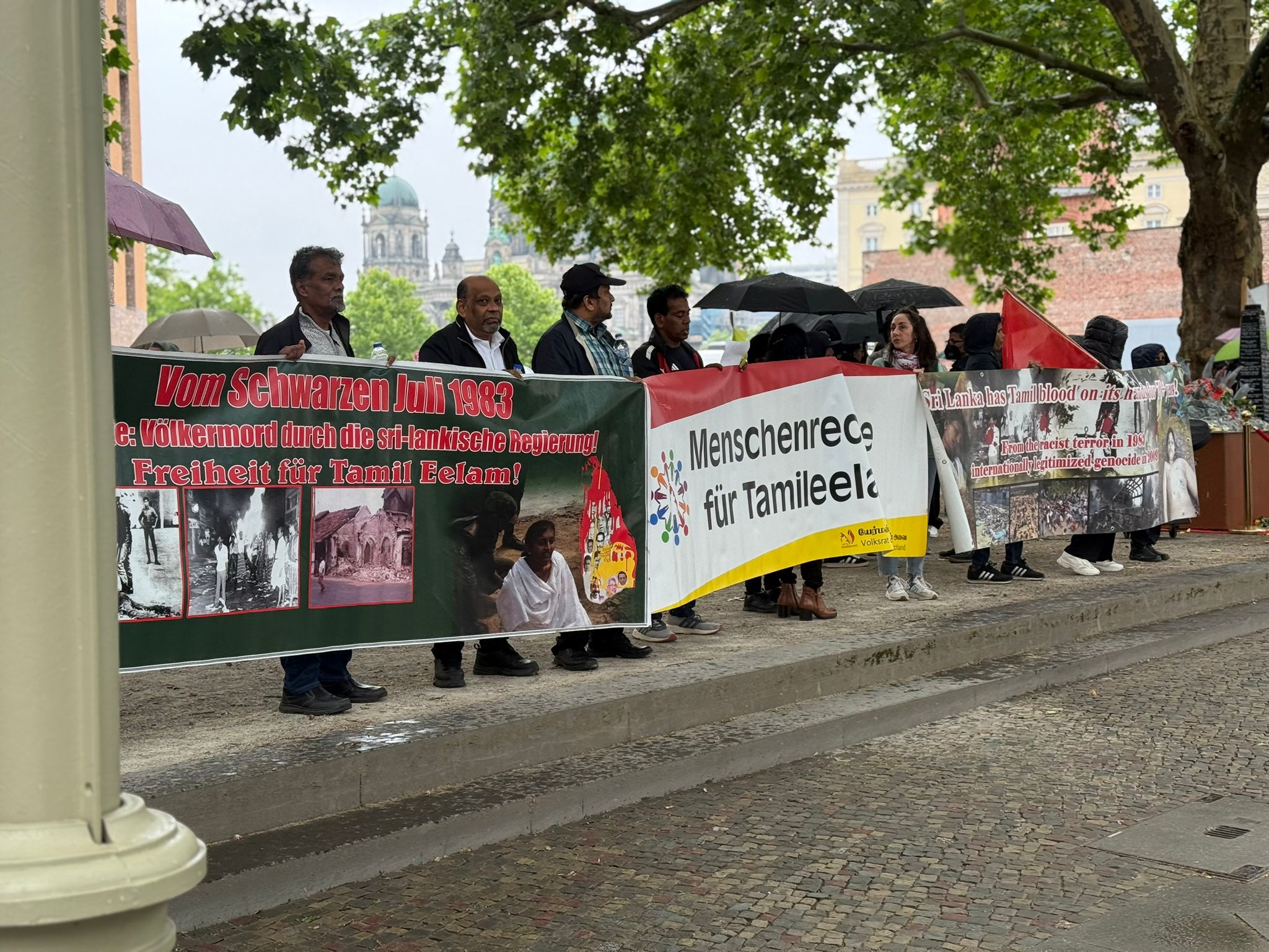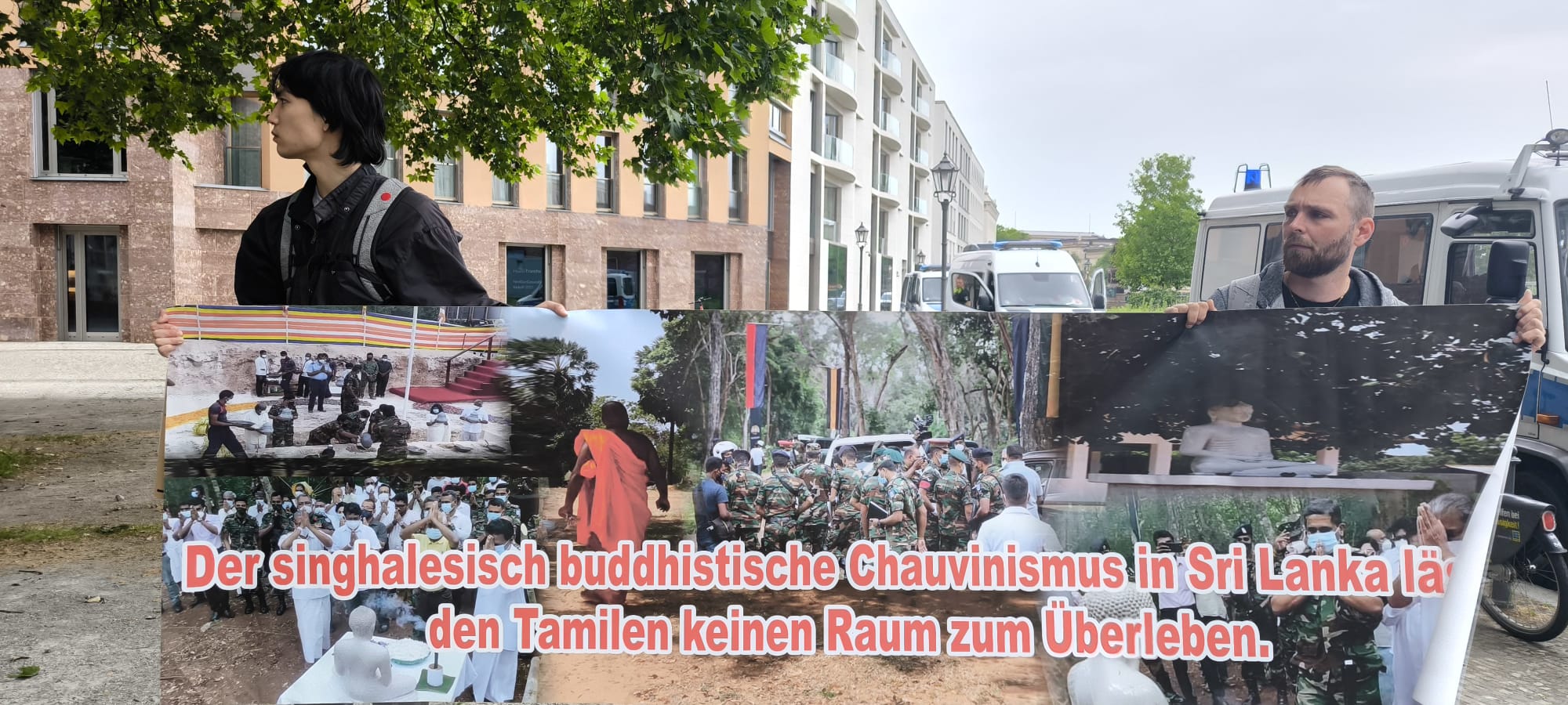 சிறிலங்கா தூதரகத்தின் பயமுறுத்தும் முயற்சிகளினையும் மீறி, இன்று பேர்லின் நகரில் உள்ள வெளிநாட்டு அலுவலகம் முன்பாக நூற்றுக்கும் மேற்பட்டவர்கள் திரண்டனர். தமிழர்களுடன் மற்ற மக்களும் கலந்து கொண்டு தங்களின் ஒற்றுமையையும் ஆதரவையும் வெளிப்படுத்தினர்.