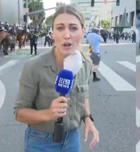 இந்நிலையில், லொஸ் ஏஞ்சல்ஸ் நகரில் நடைபெறும் போராட்டம் குறித்து செய்தி சேகரிப்பதற்காக அவுஸ்திரேலியாவை சேர்ந்த பெண் ஊடகவியலாளர் லாரன் டோமாசி சென்றிருந்தார். அங்கு வன்முறை நடைபெறும் பகுதிக்கு சென்று, அங்குள்ள நிலவரம் குறித்து கமரா முன்பு ஊடகவியலாளர் லாரன் விளக்கிக் கொண்டிருந்தார். இதன்போது, பொலிஸார் ஒருவர் ரப்பர் புல்லட் துப்பாக்கியால் லாரனை குறிவைத்து சுட்டார். இந்த சம்பவம் வீடியோவில் பதிவாகியுள்ளார்.