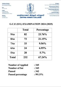 இதன்படி, யாழ். இந்துக் கல்லூரியில் பரீட்சைக்குத் தோற்றிய மாணவர்களுள் 82 பேர் 9ஏ சித்திகளைப் பெற்றுள்ளனர். சிறந்த பெறுபேறுகள்