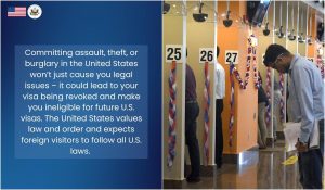 அது தொடர்பாக இந்தியாவுக்கான அமெரிக்க தூதரகம் எக்ஸ் பக்கத்தில் பகிர்ந்த பதிவில், “தாக்குதல், திருட்டு, ஒரு கட்டிடத்துக்குள் நுழைந்து பொருட்களைத் திருடுதல் போன்ற செயல்களில் நீங்கள் அமெரிக்காவில் ஈடுபட்டால், அது சட்ட சிக்கல்களை உருவாக்கும். அது உங்கள் விசா நிரந்தரமாக ரத்து செய்யப்பட்டு, அதன்பின்னர் நீங்கள் அமெரிக்காவுக்குள் என்றைக்குமே நுழையாதபடி செய்யும். சட்டம், ஒழுங்கை அமெரிக்கா மதிக்கிறது. அமெரிக்க சட்டதிட்டங்களை இங்குவரும் வெளிநாட்டவரும் பேண வேண்டும் என்று எதிர்பார்க்கிறது ” என்று தெரிவிக்கப்பட்டுள்ளது,