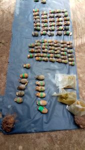 இதன்போது நேரியகுளத்தில் வீடு ஒன்றின் அருகாமையில் பிளாஸ்டிக் பரல் ஒன்றினுள் 86 கைக்குண்டுகள், ரி- 56 ரக துப்பாக்கிக்கான ரவைகள், கைத்துப்பாக்கிக்கான மூன்று ரவைகள், 5600 போதை மாத்திரைகள், 10 கிராம் ஐஸ் போதைப்பொருள் என்பன நிலத்தின் கீழ் பதுக்கி வைக்கப்பட்டிருந்த நிலையில் மீட்கப்பட்டன.