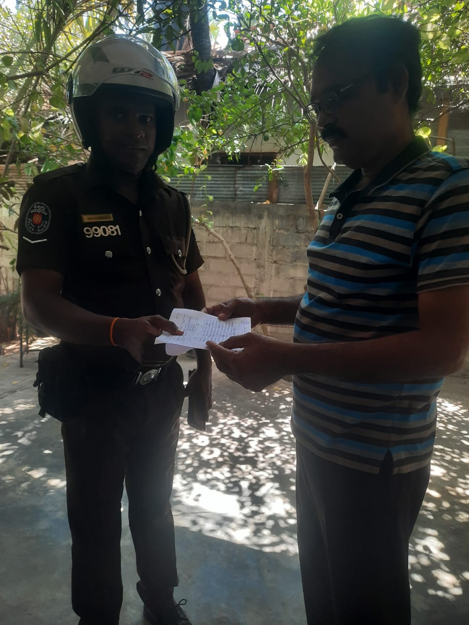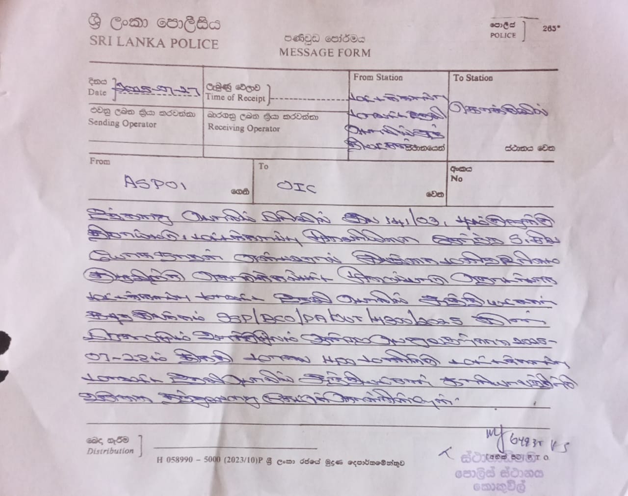 இந் நிலையல் மீண்டும் மதியம் 12 .00 மணிக்கு சென்றத மேற்படி பொலிஸ் அதிகாரி தமிழ் மொழியில் எழுதப்பட்ட கடிதத்தினை வழங்கிச் சென்றுள்ளார்.