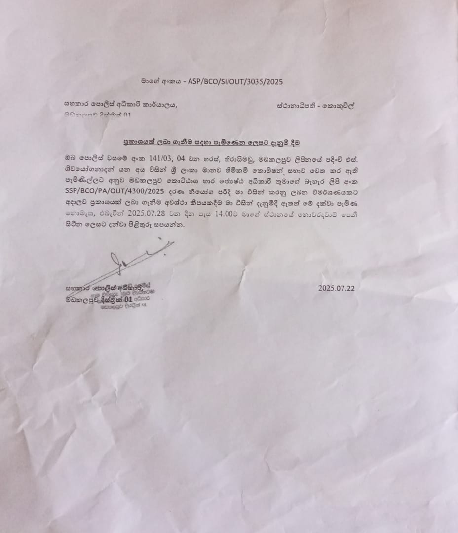 இன்று 27.07.2025 காலை 10.10 மணிக்கு மட்டக்களப்பு கொக்குவில் பொலிஸ் நிலையத்தில் இருந்து மனித உரிமை செயற்பாட்டாளர் ச.சிவயோகநாதன் அவர்களது வீட்டிற்குச் சென்ற மட்டக்களப்பு கொக்குவில் பொலிஸ் உத்தியோகத்தரால் சிங்களத்தில் ஒரு கடிதம் வழங்கப்பட்டது. கடிதம் சிங்களத்தில் உள்ளதால் அது தனது மொழி உரிமையை மீறும் செயல் என கூறி கடிதம் திருப்பி அனுப்பி பட்டுள்ளது.