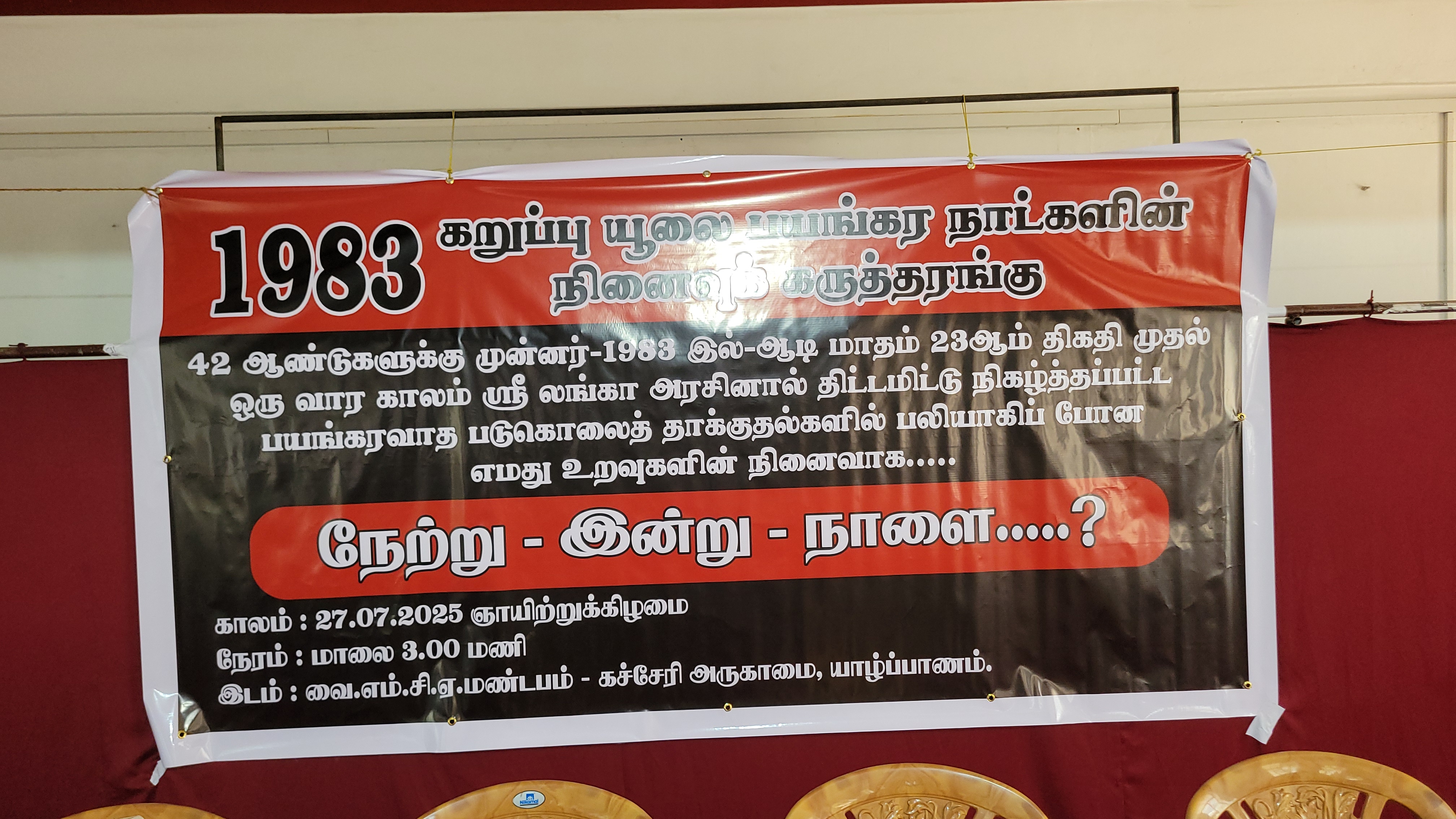 கறுப்பு ஜூலை நினைவுக் கருத்தரங்கு “நேற்று – இன்று – நாளை” எனும் தொனிப்பொருளில் யாழ்ப்பாணத்தில் ஞாயிற்றுக்கிழமை (27) நடைபெற்றது.