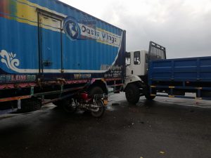 சாரதியின் கட்டுப்பாட்டை இழந்த லொறி ஒன்று வீதியில் பயணித்த மற்றுமொரு லொறி மற்றும் மோட்டார் சைக்கிளுடன் மோதியதில் இந்த விபத்து இடம்பெற்றுள்ளது.