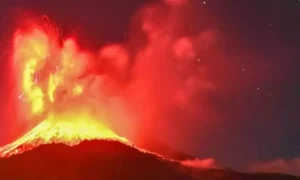 இதனால் எரிமலையில் இருந்து சுமார் 20 கிலோமீட்டர் உயரத்துக்கு தீக்குழம்பு வெளியேறியது.இதனை தொடர்ந்து அடுத்த சில மணி நேரங்களில் மீண்டும் எரிமலை வெடிக்க தொடங்கியது.