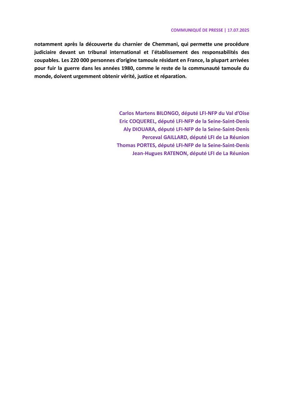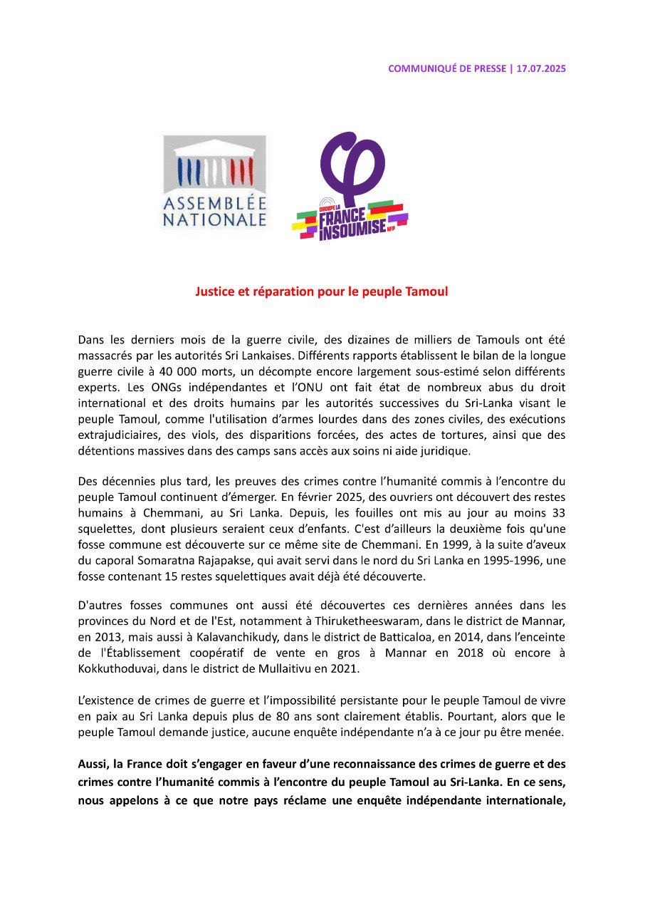 ஜூலை 17, 2025 அன்று தேசிய சட்டமன்ற உறுப்பினர்கள் வெளியிட்ட செய்திக்குறிப்பில், லா பிரான்ஸ் இன்சூமைஸ் (LFI) மற்றும் புதிய மக்கள் முன்னணி (NFP) ஆகிய கட்சிகளின் நாடாளுமன்ற உறுப்பினர்கள் தமிழ் மக்களுக்கு எதிரான பல தசாப்த கால மனித உரிமை மீறல்களைக் கண்டித்து, நீதி, உண்மை மற்றும் இழப்பீடுகளுக்கான தேவையை வலியுறுத்தினர்.