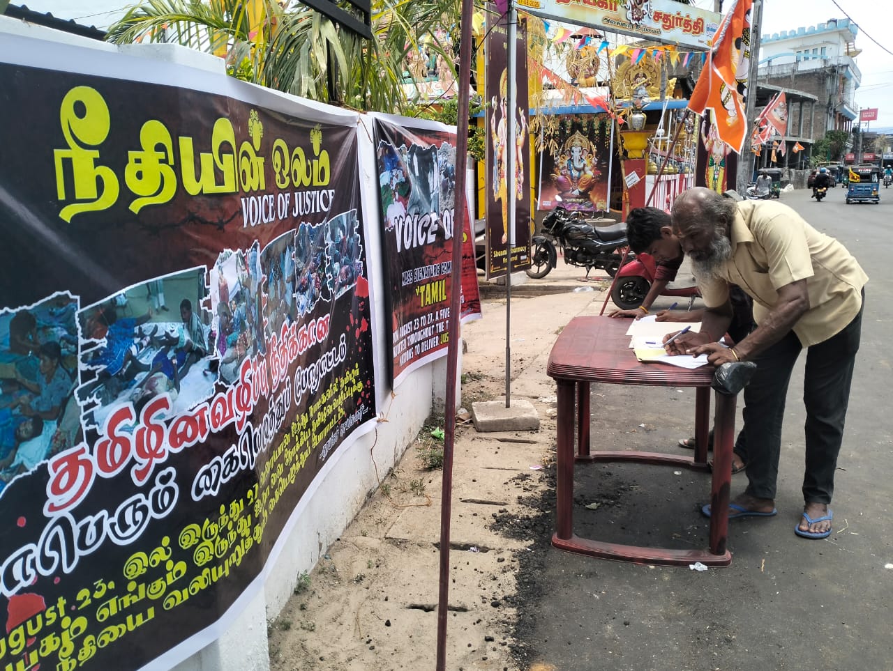 சர்வதேச நீதி கோரும் போராட்டமான நீதியின் ஓலம் (VOICE OF JUSTICE) எனும் தொனிப்பொருளுடனான பொதுமக்கள் கையெழுத்து சேகரிக்கும் போராட்டமானது சனிக்கிழமை(23) வடகிழக்கு தமிழர் தாயகம் எங்கும் எட்டு மாவட்டங்களிலும் ஆரம்பிக்கப்பட்டிருந்தது.