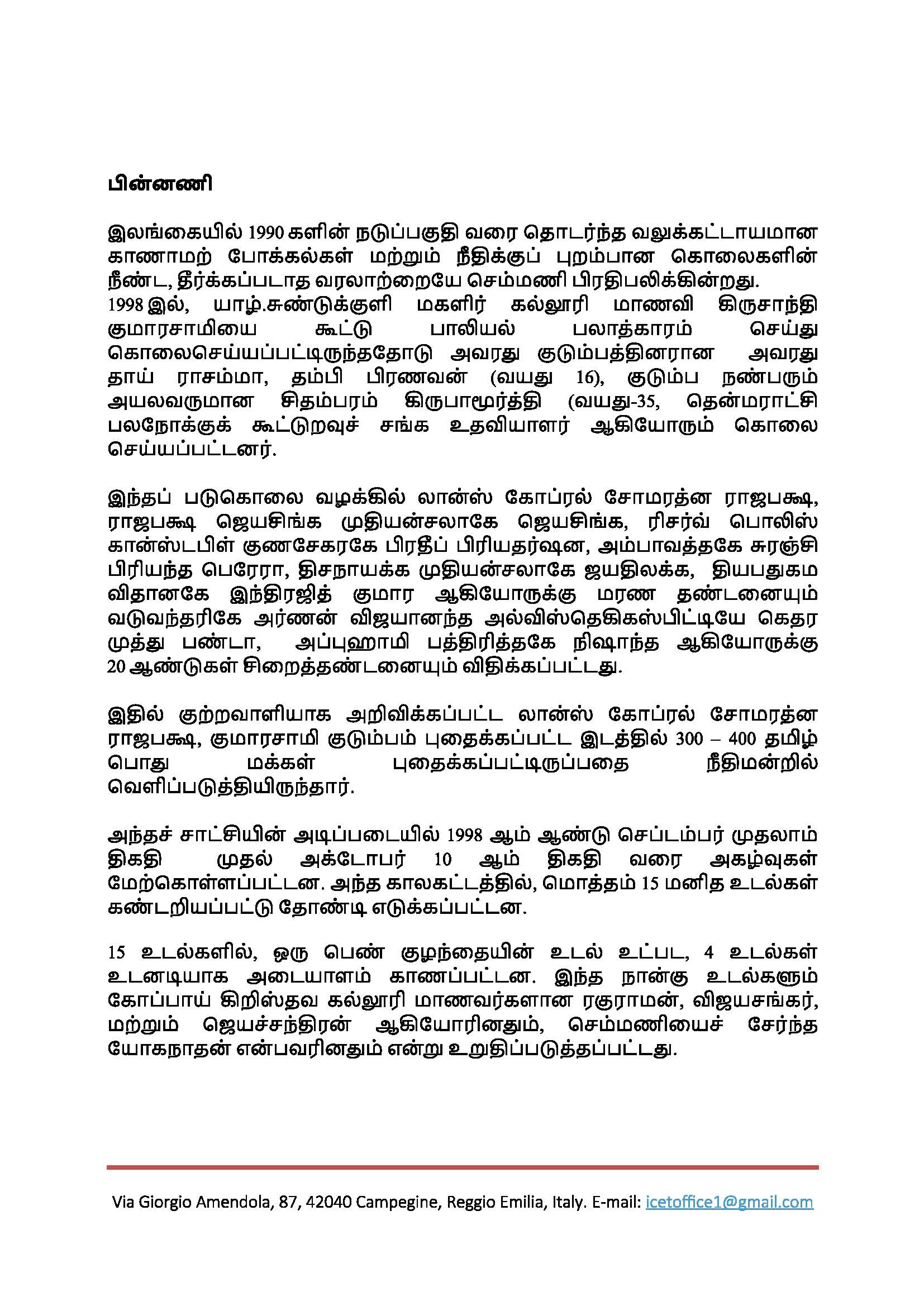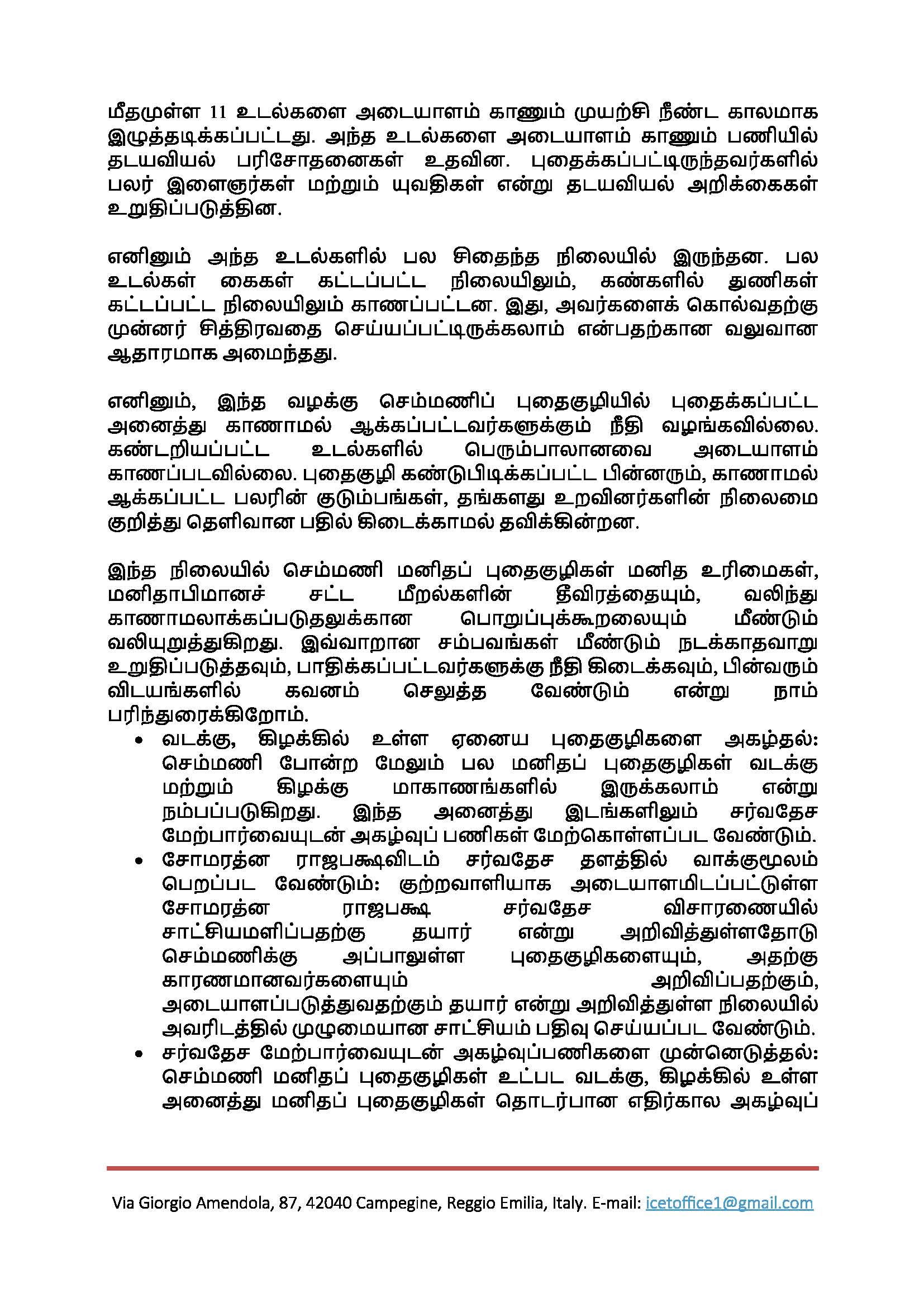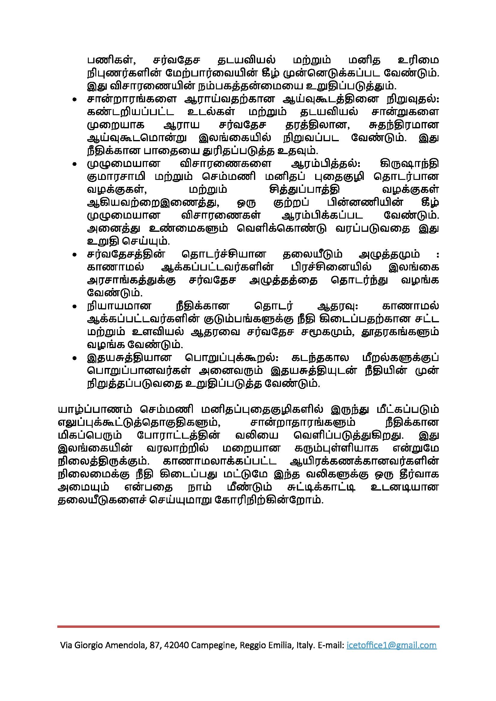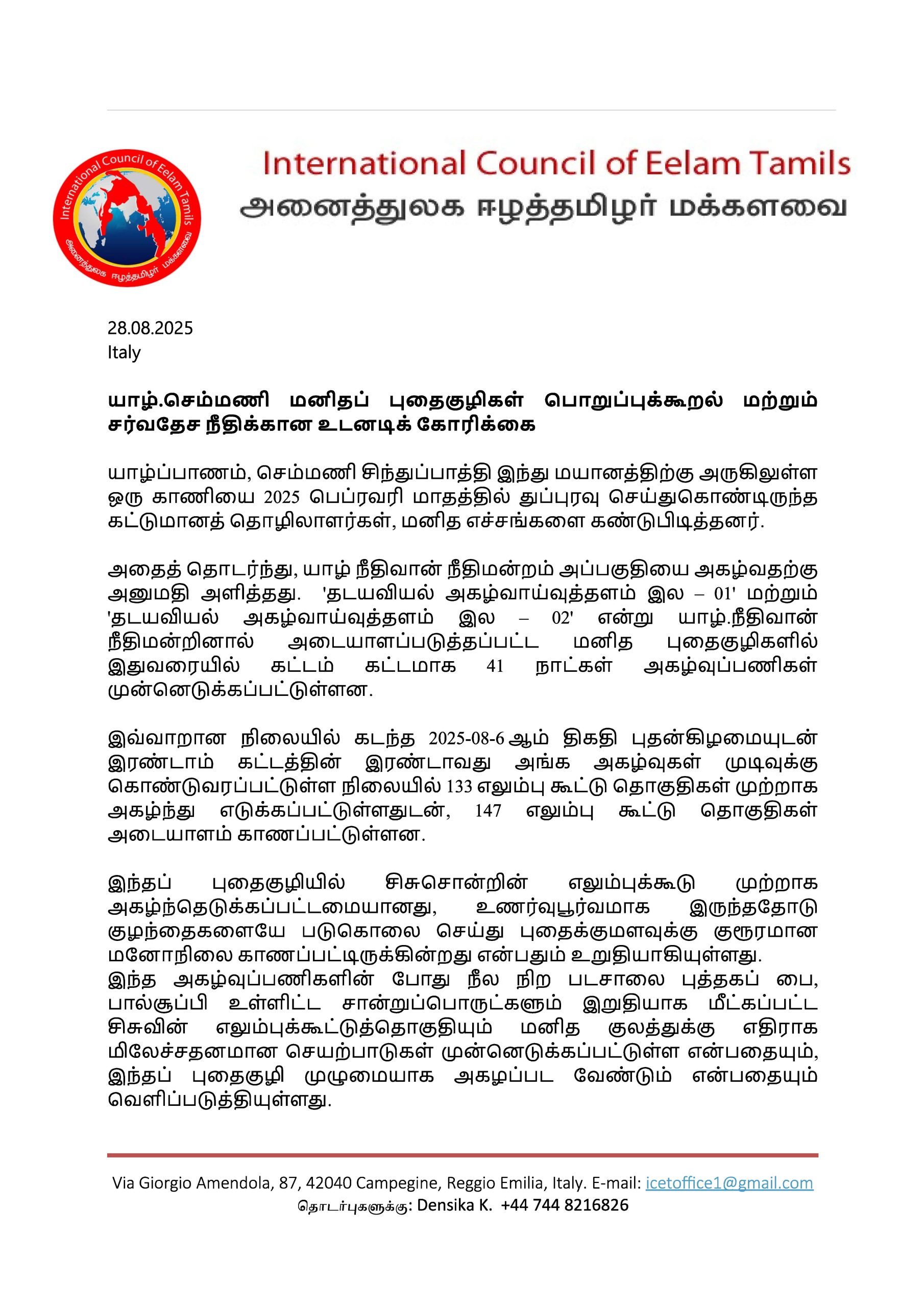 புலம்பெயர் தேசங்களில் முக்கிய செய்திகள் யாழ் .செம்மணி மனிதப் புதைதகுழிகள் பொறுப்புக்கூறல் மற்றும் சர்வதேச நீதிக்கான உடனடிக் கோரிக்கை Posted on August 29, 2025 at 19:31 by சமர்வீரன் 89 0 யாழ் .செம்மணி மனிதப் புதைகுழிகள் பொறுப்புக்கூறல் மற்றும் சர்வதேச நீதிக்கான உடனடிக் கோரிக்கை- அனைத்துலக ஈழத்தமிழர் மக்களைவையினரால் சர்வதேச நாடுகளுக்கு அனுப்பிவைக்கப்பட்ட அறிக்கையை.