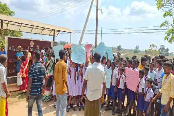 DS மாமா பேருந்து வண்டிய மீண்டும் பெற்றுதாங்க நாங்களும் ஏனையோரைப்போன்று படிக்க வேண்டும் , எமது கிராம மக்களின் குரல் தான் RDS … எமது குரலை அடக்கும் பாசிச அரசியல் வாதிகளே ஒழிக , அரசாங்கமே எங்களுடைய அடிப்படை உரிமையான போக்குவரத்தின் பறிக்காதே ,காலையில் யானைத் தொல்லை மாலையில் மாட்டு தொல்லை பாடசாலை செல்வதும் போக்குவரத்து தொல்லை ஆகிவிட்டது என்ற பல வாசகங்கள் எழுதிய பதாகைகளை ஏந்தியவாறு போராட்டத்தில் ஈடுபட்டனர்.