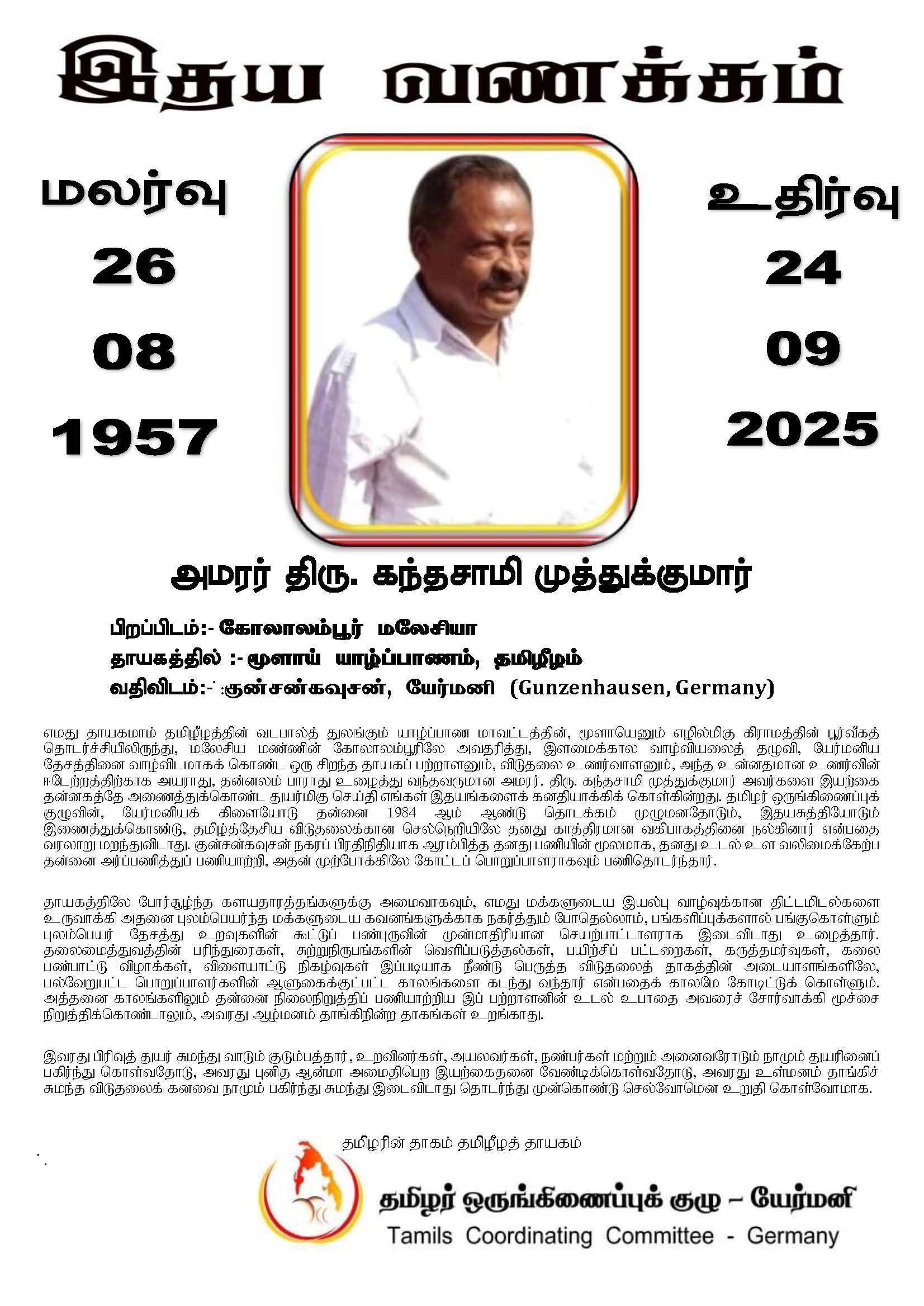எமது தாயகமாம் தமிழீழத்தின் வடபால்த் துலங்கும் யாழ்ப்பாண மாவட்டத்தின், மூளாயெனும் எழில்மிகு கிராமத்தின் பூர்வீகத் தொடர்ச்சியிலிருந்து, மலேசிய மண்ணின் கோலாலம்பூரிலே அவதரித்து, இளமைக்கால வாழ்வியலைத் தழுவி, யேர்மனிய தேசத்தினை வாழ்விடமாகக் கொண்ட ஒரு சிறந்த தாயகப் பற்றாளனும், விடுதலை உணர்வாளனும், அந்த உன்னதமான உணர்வின் ஈடேற்றத்திற்காக அயராது, தன்னலம் பாராது உழைத்து வந்தவருமான அமரர். திரு. கந்தசாமி முத்துக்குமார் அவர்களை இயற்கை தன்னகத்தே அணைத்துக்கொண்ட துயர்மிகு செய்தி எங்கள் இதயங்களைக் கனதியாக்கிக் கொள்கின்றது. தமிழர் ஒருங்கிணைப்புக் குழுவின், யேர்மனியக் கிளையோடு தன்னை 1984 ஆம் ஆண்டு தொடக்கம் முழுமனதோடும், இதயசுத்தியோடும் இணைத்துக்கொண்டு, தமிழ்த்தேசிய விடுதலைக்கான செல்நெறியிலே தனது காத்திரமான வகிபாகத்தினை நல்கினார் என்பதை வரலாறு மறந்துவிடாது. குன்சன்கவுசன் நகரப் பிரதிநிதியாக ஆரம்பித்த தனது பணியின் மூலமாக, தனது உடல் உள வலிமைக்கேற்ப தன்னை அர்ப்பணித்துப் பணியாற்றி, அதன் முற்போக்கிலே கோட்டப் பொறுப்பாளராகவும் பணிதொடர்ந்தார்.