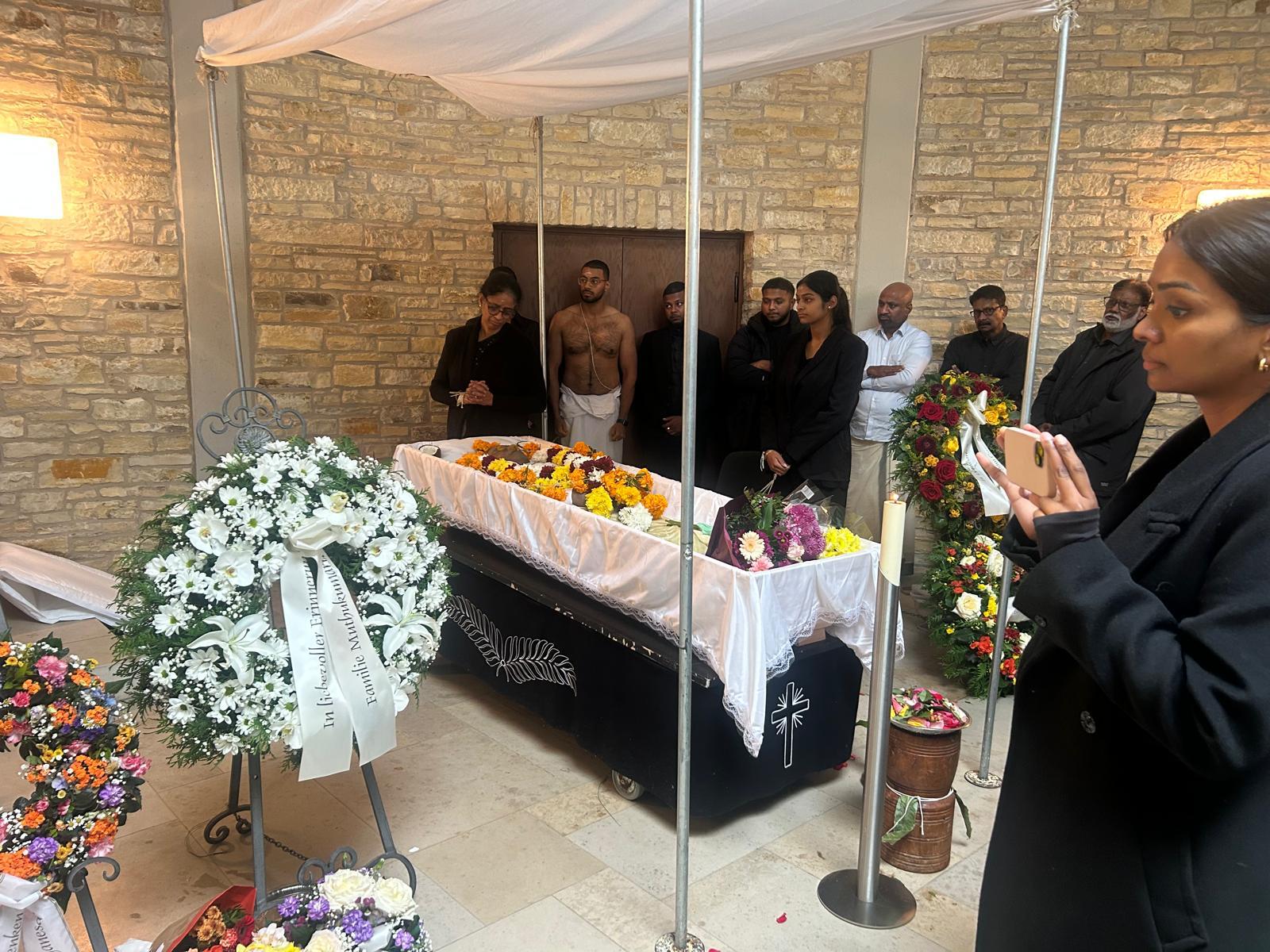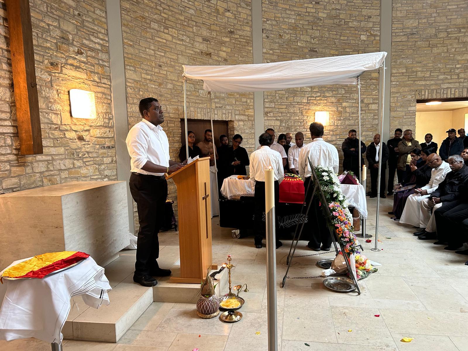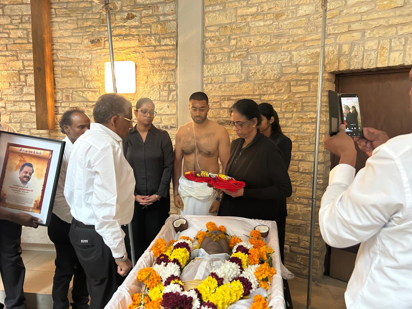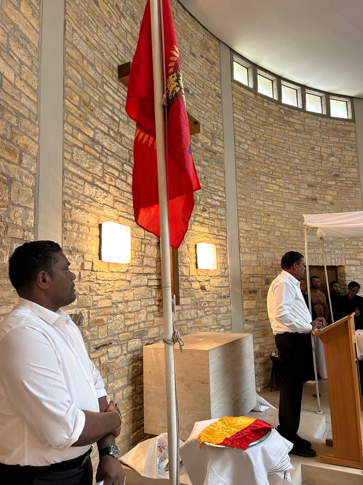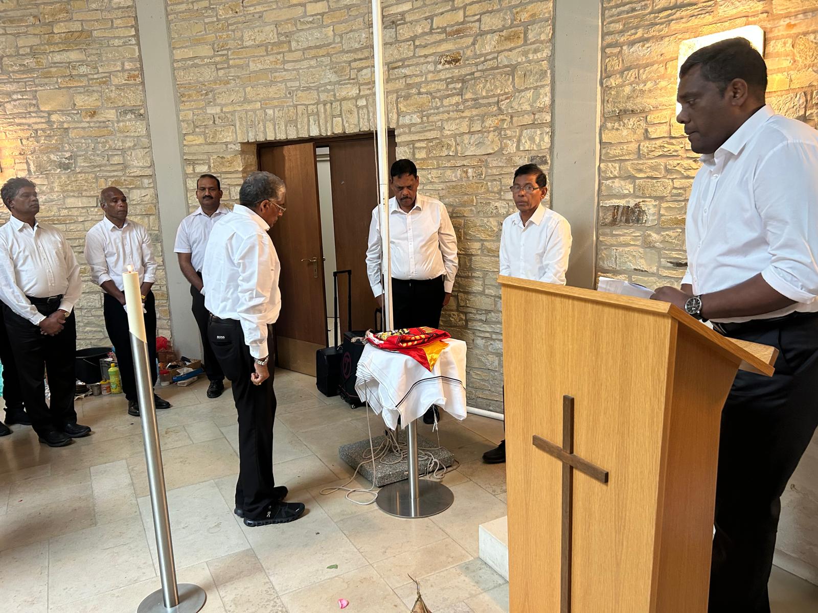 அவரது வித்துடல் வைக்கப்பட்ட மண்டபத்திலே ஈகைச்சுடரினை அவரது துணைவியார் ஏற்றிவைக்க, தமிழீழ தேசியக் கொடியினை யேர்மனிய தமிழர் ஒருங்கிணைப்புக் குழுவின் பொறுப்பாளர் ஏற்றி, அரைக்கம்பத்திலே பறக்க விடப்பட்டது. ஈகைச்சுடரினை நாட்டுப்பற்றாளரின் புதல்வன் ஏற்றிவைத்தார். செயற்பாட்டாளர்களால் கையேந்தி வரப்பட்ட தமிழீழ தேசியக் கொடி அவரது வித்துடல்மீது போர்த்தப்பட்டு அகவணக்கம் செலுத்தப்பட்டது.