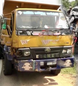 டிப்பர் வாகனமும் முச்சக்கரவண்டியும் ஒன்றுடன் ஒன்று மோதியதில் இந்த விபத்து இடம்பெற்றுள்ளதாக பொலிஸார் தெரிவித்தனர்.