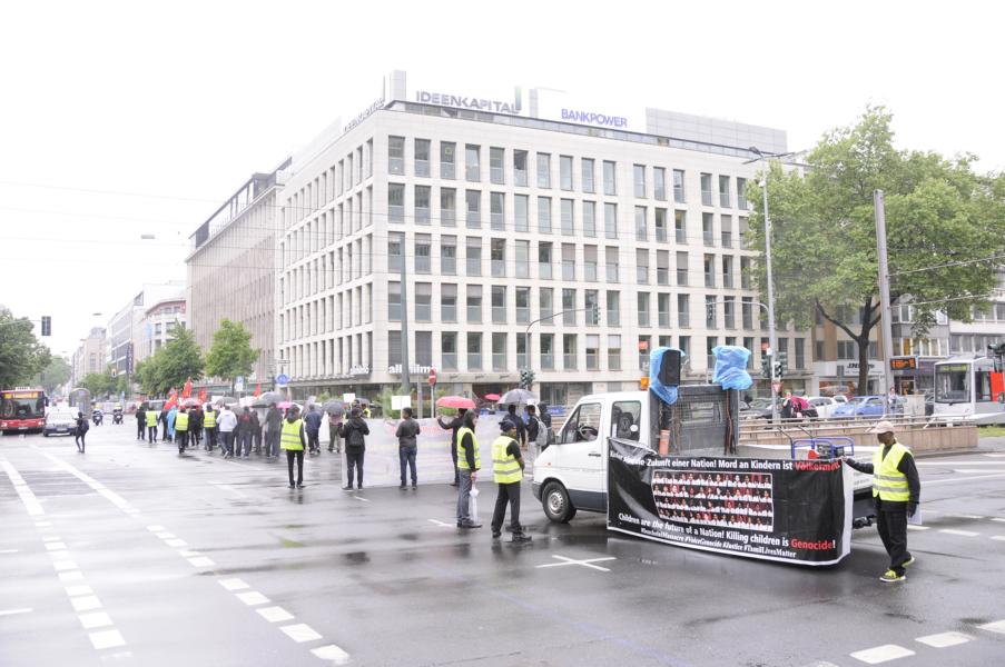 செல்லும் வழிகளில் இனப்படுகொலை சம்பந்தமான துண்டுப்பிரசுரங்களை யேர்மனிய மக்களுக்கு விநியோகித்தபடியும் எமக்கான நீதி மறுக்கப்பட்டிருப்பதை இளையோர்கள் ஒலிபெருக்கிமூலம் யேர்மனிய மக்களுக்கு அறிவித்தபடியும் ஊர்வலமாகச் சென்றமக்கள் கைகளில் பதாதைகளைத் தாங்கியும் சென்றனர்.