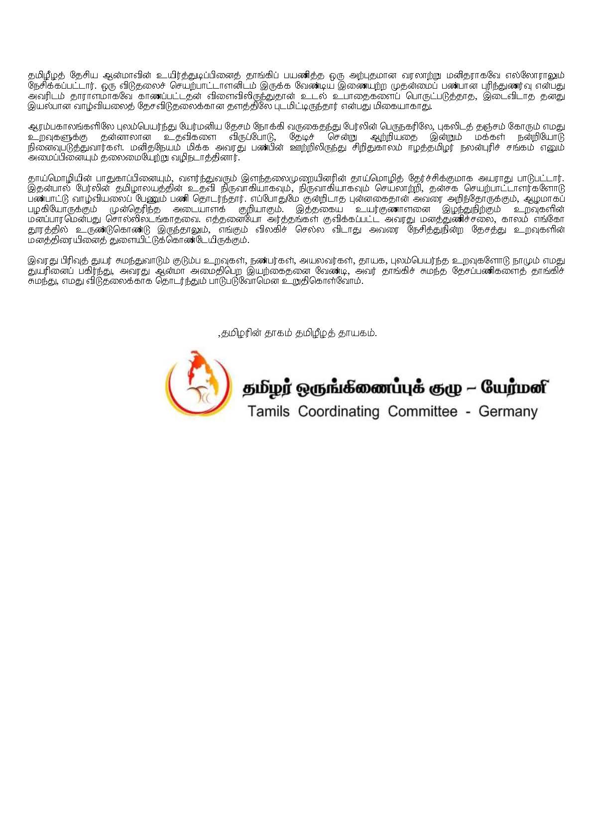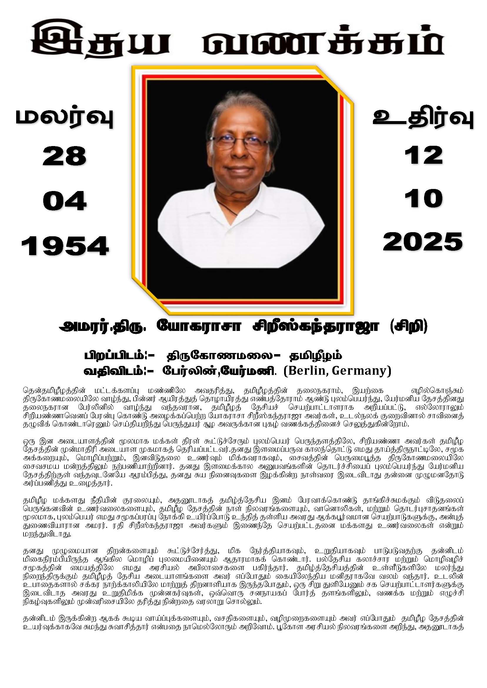 தென்தமிழீழத்தின் மட்டக்களப்பு மண்ணிலே அவதரித்து, தமிழீழத்தின் தலைநகராம், இயற்கை எழில்கொஞ்சும் திருகோணமலையிலே வாழ்ந்து, பின்னர் ஆயிரத்துத் தொழாயிரத்து எண்பத்தோராம் ஆண்டு புலம்பெயர்ந்து, யேர்மனிய தேசத்தினது தலைநகரான பேர்லினில் வாழ்ந்து வந்தவரான, தமிழீழத் தேசியச் செயற்பாட்டாளராக அறியப்பட்டு, எல்லோராலும் சிறியண்ணாவெனப் பேரன்பு கொண்டு அழைக்கப்பெற்ற யோகராசா சிறீஸ்கந்தராஜா அவர்கள், உடல்நலக் குறைவினால் சாவினைத் தழுவிக் கொண்டாரெனும் செய்தியறிந்து பெருந்துயர் சூழ அவருக்கான புகழ் வணக்கத்தினைச் செலுத்துகின்றோம்.