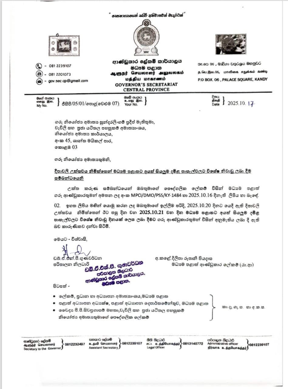 மத்திய மாகாணத்திலுள்ள அனைத்து தமிழ் பாடசாலைகளுக்கும் தீபாவளி பண்டிகையை முன்னிட்டு பண்டிகைக்கு மறுநாள் செவ்வாய்க்கிழமை (21) மத்திய மாகாண ஆளுநரால் விசேட விடுமுறை வழங்கப்பட்டுள்ளது.