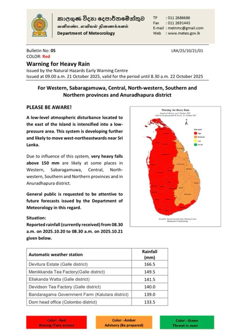 மேற்கு, சப்ரகமுவ, மத்திய, வடமேல், தென், மற்றும் வட மாகாணங்கள் மற்றும் அநுராதபுரம் மாவட்டத்தில் நாளை (அக்டோபர் 22) காலை 08.30 மணி வரை கனமழை பெய்யக்கூடும் என வானிலை ஆய்வு மையம் எச்சரிக்கை விடுத்துள்ளது.