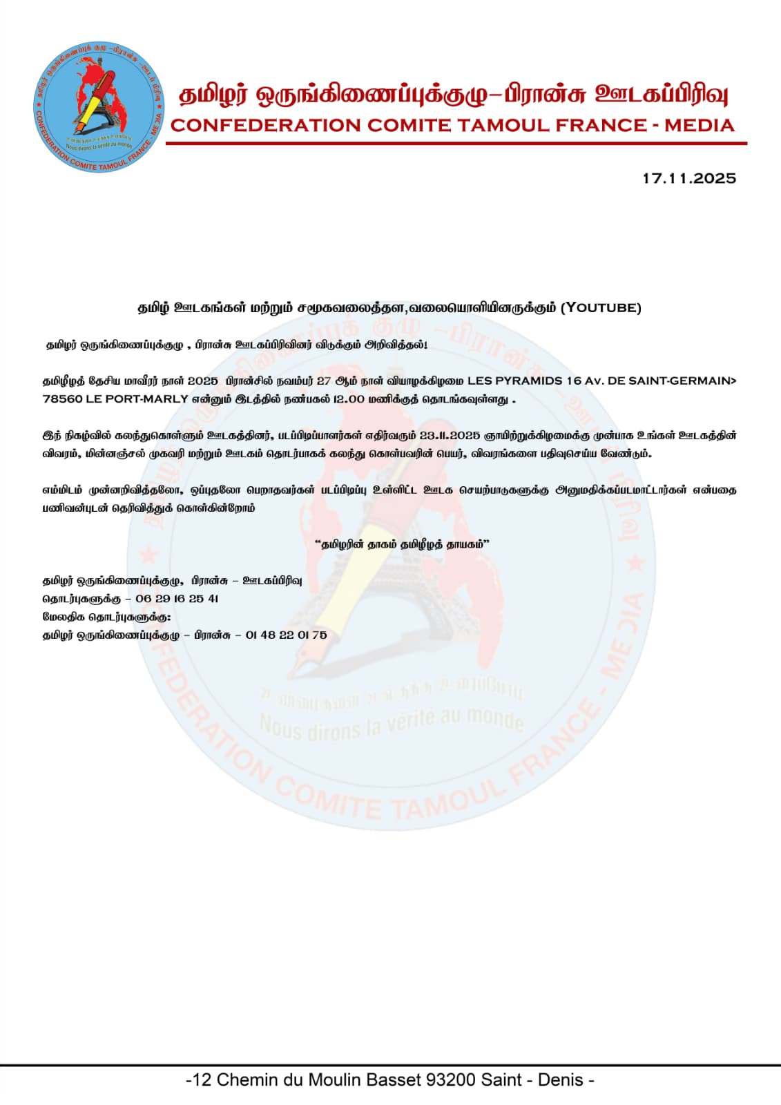தமிழீழத் தேசிய மாவீரர் நாள் 2025 – பிரான்சில் நவம்பர் 27 ஆம் நாள் வியாழக்கிழமை LES PYRAMIDS 16 Av. DE SAINT-GERMAIN, 78560 LE PORT-MARLY என்னும் இடத்தில் நண்பகல் 12.00 மணிக்குத் தொடங்கவுள்ளது .