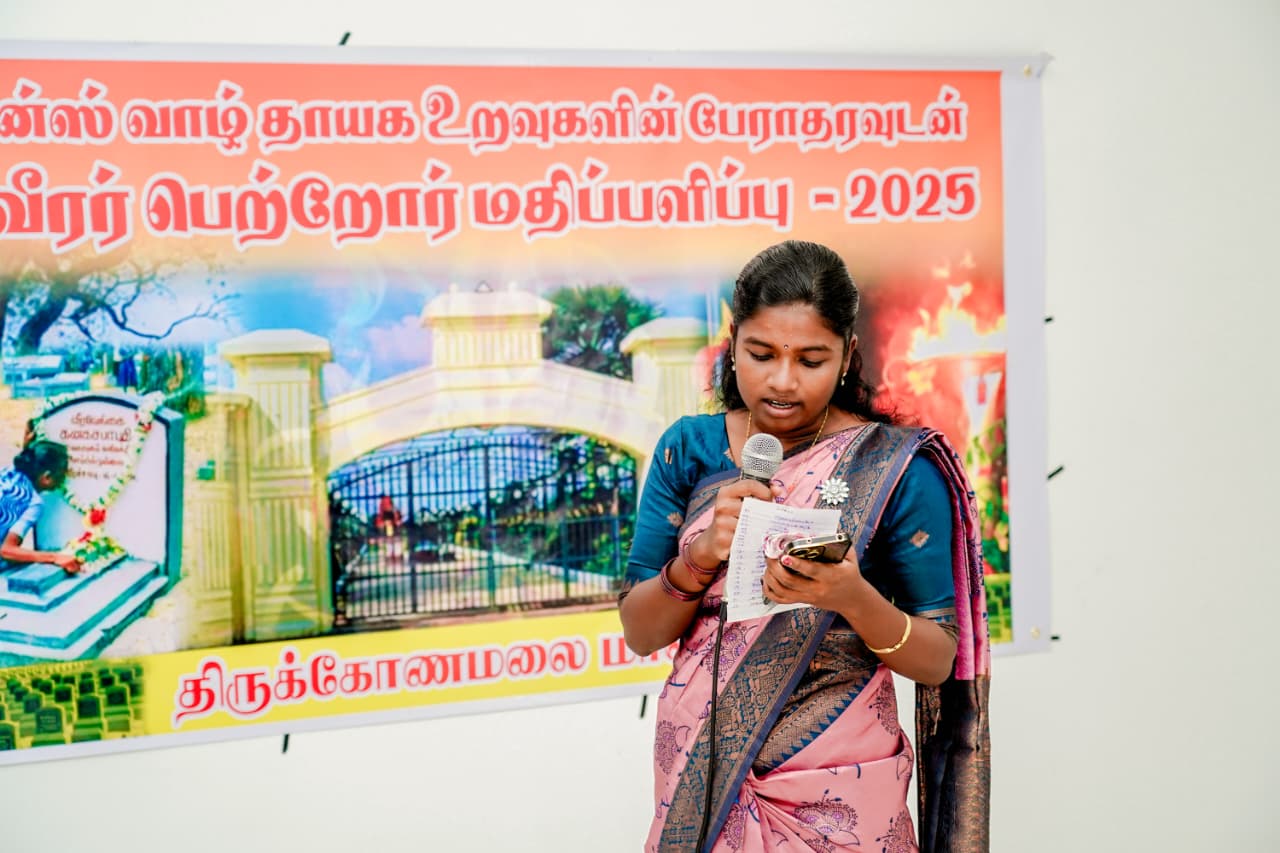 மாவீரர் நாளினை முன்னிட்டு, திருமலை மாவட்டத்தில் நடைபெற்ற மாவீரர் பெற்றோர் மற்றும் உரித்துடையோரிற்கான மதிப்பளிப்பு நிகழ்வானது, ஏற்பாட்டுக்குழுவினரின் ஒழுங்கமைப்பில் பிரான்சு வாழ் தாயக உறவுகளின் பேராதரவுடன் வெருகல் பிரதேச மாவீரர் பெற்றோர்கள் 150 க்கு மேற்பட்டோர் பங்கேற்புடன் கலாச்சார மண்டபத்தில் 19/11/2025 இன்று காலை 10:00 மணியளவில் இடம்பெற்ரது.