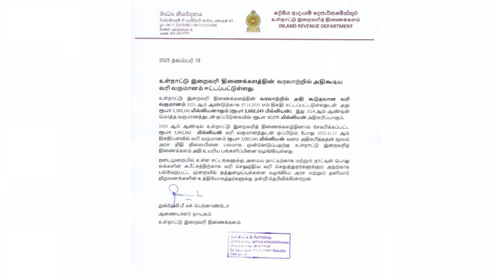 அதன்படி, 2024 ஆம் ஆண்டுடன் ஒப்பிடுகையில் இந்த ஆண்டில் 60,079 மில்லியன் ரூபாய் வரி வருமானம் அதிகரிக்கப்பட்டுள்ளதாக உள்நாட்டு இறைவரித் திணைக்களம் தெரிவித்துள்ளது. அதிக கூடிய வரி வருமானத்தை ஈட்டியதால் அரச நிதி நிலையினை பலமாக முன்னெடுப்பதற்கு உள்நாட்டு இறைவரித் திணைக்களம் அதிகளவு பங்களிப்பை வழங்கியுள்ளது.