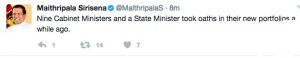 9 புதிய அமைச்சர்கள் மற்றும் பிரதி அமைச்சர்கள் சற்று நேரத்துக்கு முன்னர் பதவிப் பிரமாணம் செய்துகொண்டதாக ஜனாதிபதி மைத்திரிபால சிறிசேன தெரிவித்துள்ளார்.